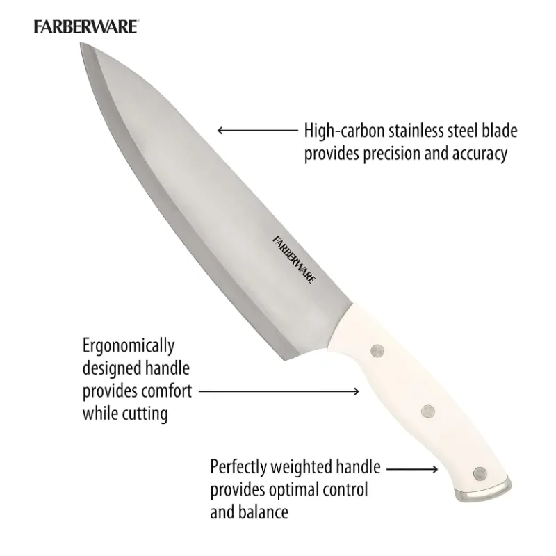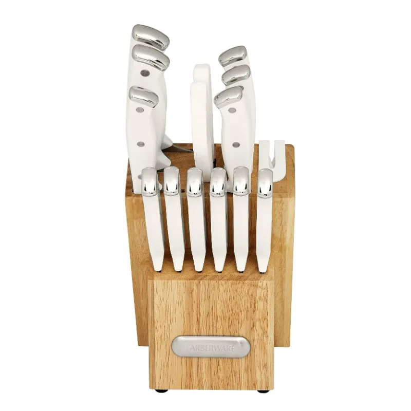 Sempre tenha a faca afiada certa à mão, com este conjunto de talheres branco rebite triplo Farberware com apontador Edgekeeper® embutido. Cada faca tem uma borda fina, lâmina de aço inoxidável de alto carbono e cabo de plástico ergonomicamente projetado que proporciona um aperto confortável. O conjunto apresenta alças brancas com rebites triplos e detalhes em um bloco de madeira natural que complementa qualquer decoração e mantém todas as suas facas essenciais organizadas e ao alcance de sua bancada. Este bloco exclusivo também possui um slot Edgekeeper(R) Sharpener. Se você precisar afiar uma lâmina, basta deslizá-la pelo slot para um aprimoramento rápido e conveniente da borda. O conjunto de 14 peças inclui: faca de chef de 8 polegadas, faca de fatiar de 8 polegadas, faca Santoku de 5 polegadas, faca serrilhada de 5-1/2 polegadas, faca de borda fina de 5-1/2 polegadas, 3-1/2 faca de aparar de polegada, seis facas de bife de 4-1/2 polegada, tesouras para todos os fins e bloco de armazenamento de madeira natural com apontador embutido. Lave as facas à mão com água morna e detergente neutro, enxágue e seque imediatamente. Facas de aço inoxidável não são laváveis.