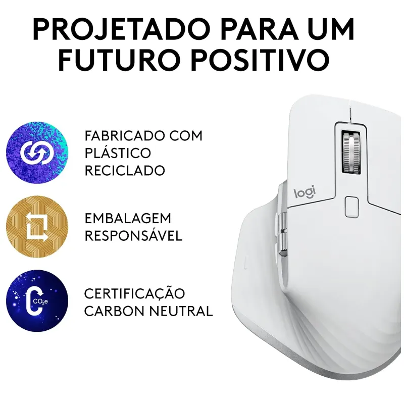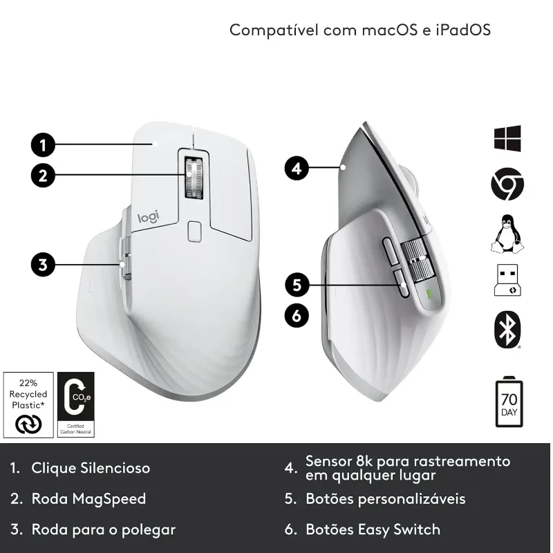 Resolução máxima de 8000 DPI. Até 70 dias com uma carga completa. Bateria recarregável (500mAh). Conexão com até 3 dispositivos. 3 horas de uso com uma carga de 1 minuto. Tecnologia sem fio avançada de 2,4 GHz. Tracking em qualquer superficíe. Cliques Silenciosos. Rolagem MagSpeed. Design Ergonômico. Resolução máxima de 8000 DPI. Até 70 dias com uma carga completa. Bateria recarregável (500mAh). 3 horas de uso com uma carga de 1 minuto. Tecnologia sem fio avançada de 2,4 GHz. COMPATIBILIDADE Windows 10,11 ou superior macOS 10.15 ou superior iOS 13.4 ou superior iPadOS 14 ou superior Linux Chrome OSTM AndroidTM 5.0 ou superior BLUETOOTH® Tecnologia Bluetooth de baixa energia.