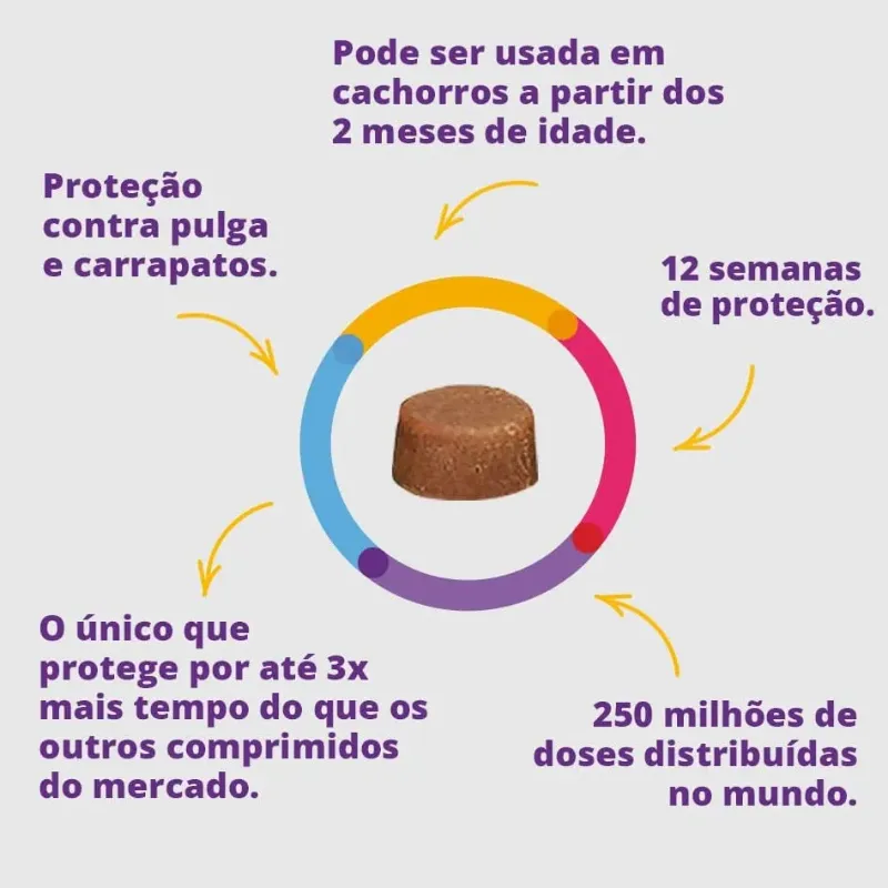 Para o tratamento de infestações por carrapatos e pulgas, em cães, proporcionando 12 semanas de proteção. Esse produto veterinário é um inseticida e acaricida sistêmico com longa duração de ação que promove eficácia imediata e persistente por 12 semanas contra carrapatos (formas adultas e jovens de Ixodes ricinus, Ixodes hexagonus, Ixodes scapularis, Ixodes holocyclus, Dermacentor reticulatus, Dermacentor variabilis e Rhipicephalus sanguineus) e pulgas (Ctenocephalides felis e Ctenocephalides canis).
