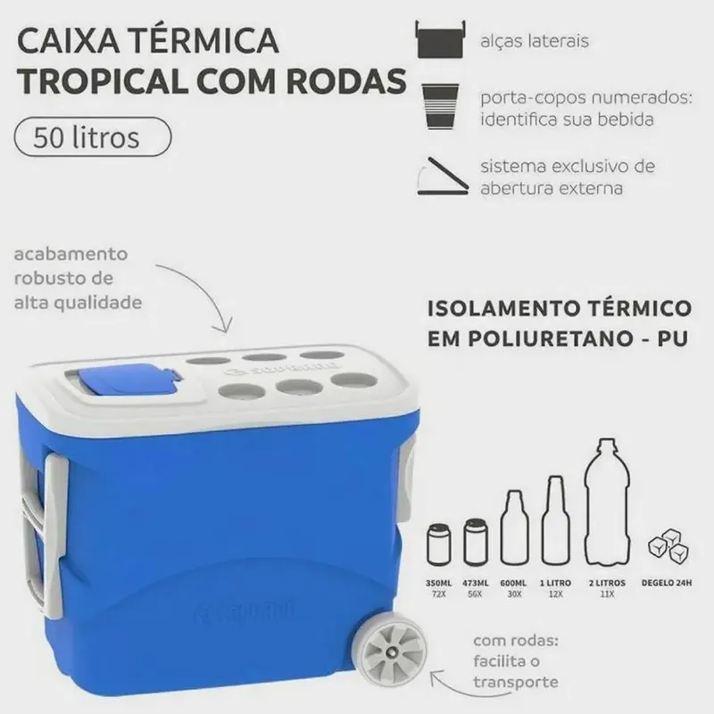 Isolamento térmico em poliuretano (PU), tampa de acesso rápido exclusiva, com porta copos numerados: identifica sua bebida acabamento robusto de alta qualidade corpo externo com material que suporta impactos Alças laterais e alongadas para facilitar a locomoção Com rodas: facilita o transporte. Degelo de 24 horas. Livre de Bisfenol (BPA Free).