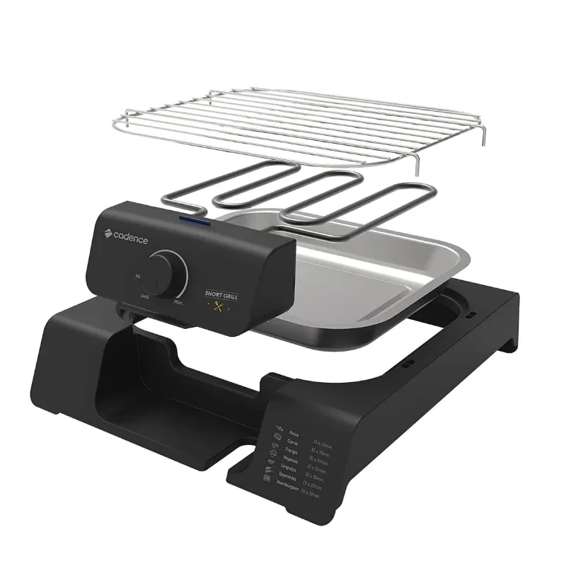Compacto e de fácil manuseio, o Churrasqueira Elétrica Cadence Short Grill é ideal para qualquer tipo de cozinha, é indicado para quem tem pouco espaço em casa ou no apartamento, e pode ainda ser levado para qualquer lugar que tenha energia elétrica, como acampamentos e piqueniques com a família e os amigos. Características Design exclusivo Traz maior praticidade no uso. Com alças laterais para transportar, também possui bandeja coletora de gordura, indicador do nível de água e ajuste de altura na grelha, para controlar melhor o preparo dos alimentos. Compacto 350 x 80 x 355 mm. Super compacto e ideal para qualquer tipo de cozinha. Potente 1200W Assa e grelha carnes, legumes e hambúrgueres de maneira rápida e prática. Controle Termostato contínuo: Níveis mínimo e máximo de temperatura podem ser controlados ao girar o botão. Temperatura mínima de 50ºC a 100ºC e máxima entre 210ºC a 250ºC. Prático Totalmente desmontável! O que torna mais fácil sua limpeza. Além de super leve com 1,05 Kg e comprimento cabo de Força: 70 cm