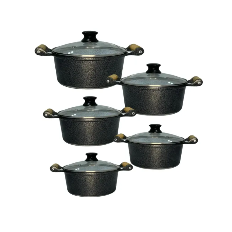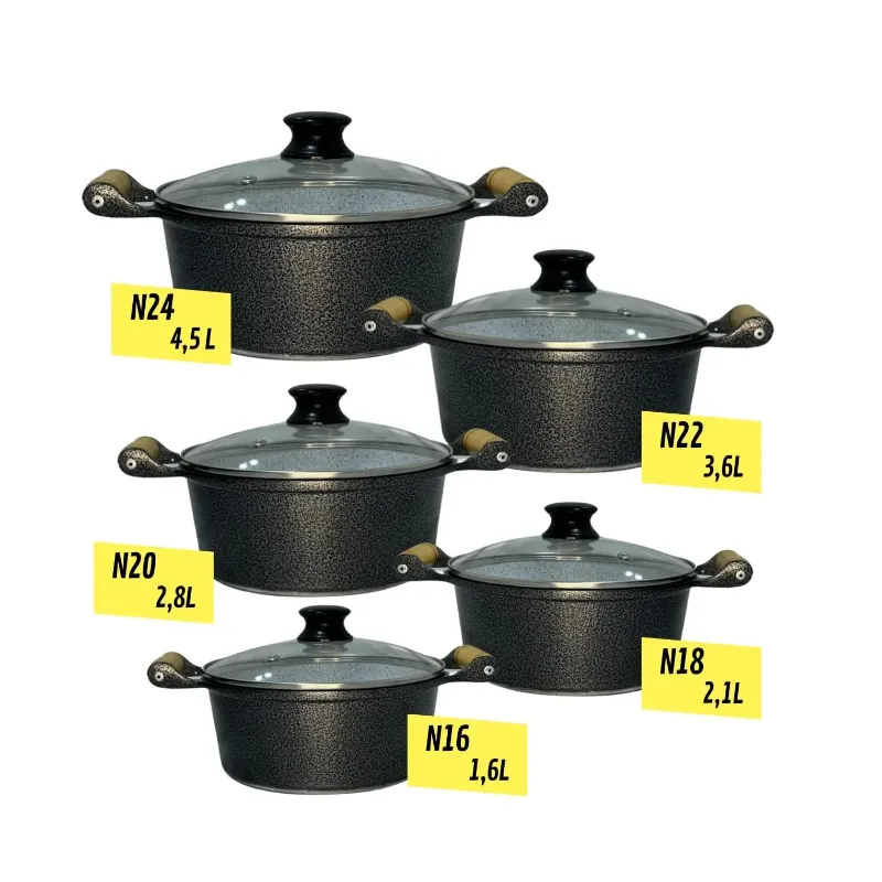 Jogo 5 Panelas Cerâmica Aluminio Fundido Antiaderente, Cabo de Madeira Cerâmica Atoxica