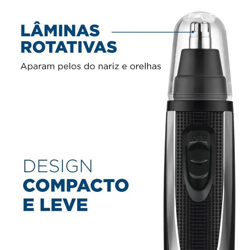 O Aparador de Pelos Mondial TR-01 remove os pelos indesejados do nariz e orelhas de maneira rápida e eficiente. As lâminas rotativas são supereficientes e aparam os pelos instantaneamente. Possui design compacto e leve, o que facilita o manuseio, e funciona com apenas 1 pilha AA. Saiba mais sobre o TR-01 da Mondial:LÂMINAS ROTATIVAS: As lâminas são supereficientes e aparam os pelos do nariz e das orelhas de maneira rápida e sem desconforto.