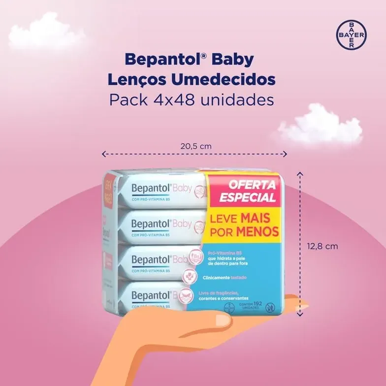 A Bayer sabe que a limpeza do seu bebê é essencial, por isso criou os lenços umedecidos Bepantol Baby, que vão além dos lenços comuns. Com sua fórmula exclusiva, os lenços umedecidos Bepantol Baby contêm Pró Vitamina B5 que hidrata a pele de dentro para fora. Livres de fragrâncias, corantes e conservantes, esses lenços promovem uma limpeza pura e delicada para a pele sensível do seu bebê. Eles são clinicamente testados e hipoalergênicos, para garantir a segurança do seu pequeno. Esses lenços são ideais para a troca de fraldas e limpeza das mãos e rosto do bebê. Compre agora os lenços umedecidos Bepantol Baby para garantir a limpeza pura e delicada que seu bebê merece. Para uma proteção extra, após a limpeza com os Lenços Umedecidos Bepantol Baby, aplique uma camada de Bepantol Baby Creme Antiassaduras. Descarte o lenço usado logo após o uso e não jogue no vaso sanitário. Escolha os lenços umedecidos Bepantol Baby para uma limpeza pura e delicada, e sinta o puro amor em cada troca.