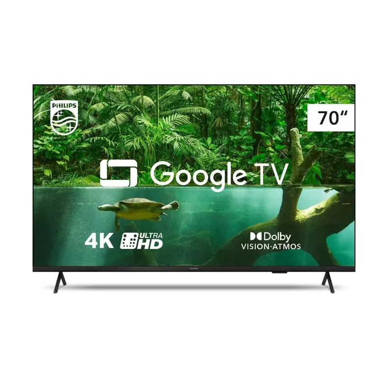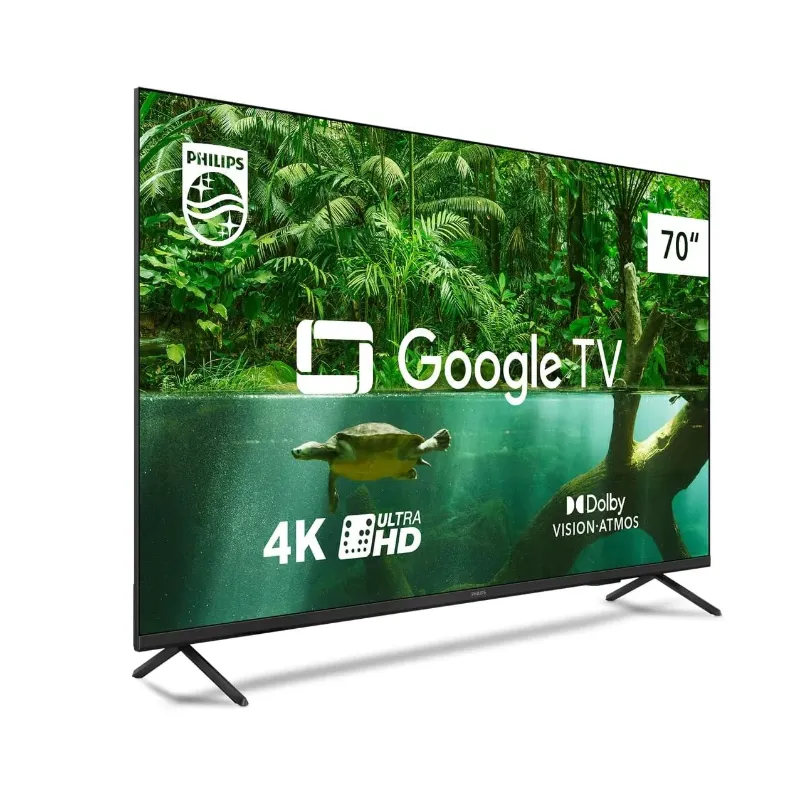 Smart TV Philips Série 7408 - TV 4K mais completa da categoria. - Google TV: Não perca mais tempo buscando pelo que assistir. A plataforma Google TV oferece conteúdos personalizados de acordo com o seu perfil, para facilitar ainda mais no dia a dia. Tenha acesso à Google Play Store e aproveite todo o acervo de apps disponíveis pelo Google. Aproveite ainda o Chromecast Integrado para transmitir ou espelhar o conteúdo de diversos dispositivos. - Comando de Voz Integrado: Google Assistente Integrado ao Controle Remoto para comandar a TV ou realizar buscas facilmente usando apenas a sua voz - Qualidade de Imagem Philips: Equipada com a engine de imagem Pixel Precise UHD, assista a seus conteúdos em imagens 4K de tirar o fôlego. Aproveite para assistir seus filmes e séries favoritos em todos os principais formatos de HDR. - Dolby Vision/Atmos: Aproveite para assistir suas séries e filmes com a mais alta qualidade de imagem e som de cinema. - VRR e ALLM: Desempenho máximo em consoles de nova geração, baixíssima latência e tempo de resposta, sem lags ou rasgos horizontais na tela. - Wifi Dual Band e Bluetooth 5.0: Aproveite a máxima velocidade da sua banda larga e conecte seus dispositivos favoritos com uma conexão bluetooth 5.0. - Design sem bordas: Design elegante sem bordas para se encaixar perfeitamente em qualquer ambiente e aproveitar ao máximo a imagem da sua TV.