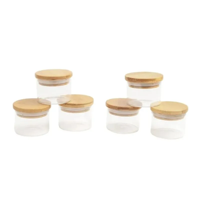 Esse é o kit de 6 potes de mantimentos de vidro borossilicato de 110ml com tampa de bambu da OIKOS. Mestre na conservação: o anel de silicone na tampa garante uma vedação total do pote – conservando os alimentos por muito mais tempo. Versátil: não é só de comida que vive esse pote: cabe algodão, pisca-pisca, pilhas, dados, acessórios de cabelo, joias, itens de escritório, flores secas, fios e o que mais você quiser guardar. Acabamento especial: a tampa de bambu é selada para suportar umidade. dá para guardar alimentos mais líquidos e pode até ir na geladeira. bacana, né? Tampa flat: sua tampa lisa de bambu é fácil de limpar e otimiza o seu espaço, além de ficar uma graça na cozinha ;) Higiênico e durável: seu corpo de vidro borossilicato é bastante resistente, e a tampa de bambu natural evita a proliferação de bactérias. Design decorativo: funcional e bonito, esse potinho transita muito bem entre os diferentes cômodos da casa, espalhando seu charme por onde quer que vá – quarto, banheiro, cozinha, sala, escritório ou lavanderia, você que manda." Fácil de limpar: pode ser lavado na água corrente com esponja e detergente neutro. A tampa produto é selada para proteger contra a umidade, mesmo assim não deve ser imerso em água por muito tempo. :: quando não estiver em uso, guardar em local seco e arejado." Medidas do produto: Altura: 5,5Cm Largura: 9,5 Cm Comprimento: 5,5Cm