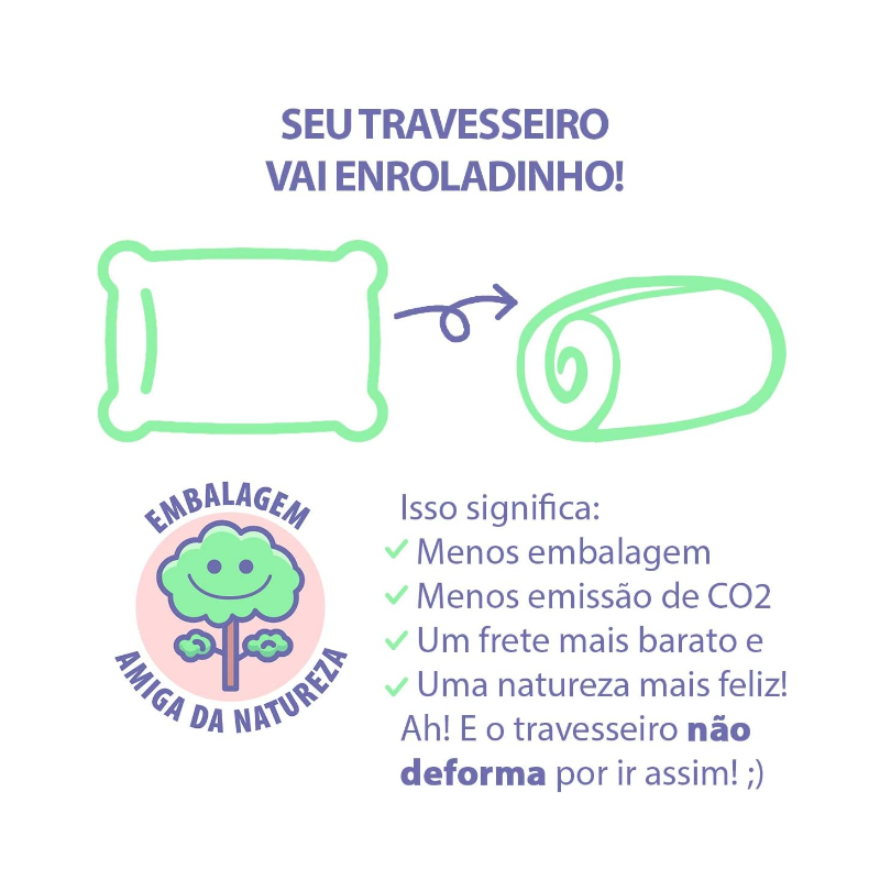 Pensando na sustentabilidade, enviamos seu travesseiro enroladinho. É usado menos embalagens e não ocupa espaço no caminhão, que consequentemente diminui a emissão de CO2, polui menos e o frete sai bem mais barato. A natureza agradece né? Ah, e o travesseiro não deforma por ser embalado dessa forma, ok? Bons sonhos.