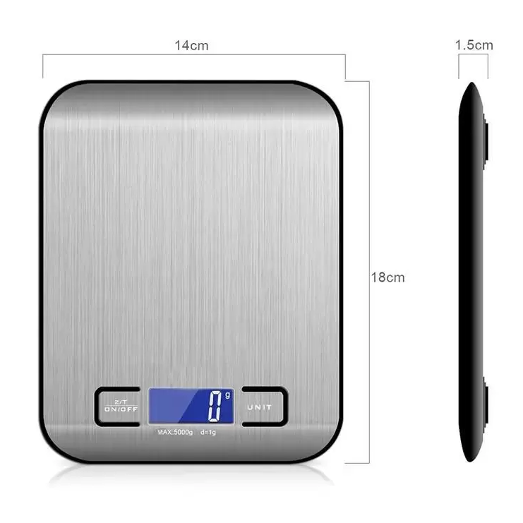 As medidas da balança são de 2,5 centímetros de altura, 15 centímetros de largura, comprimento: 18,5 centímetros e peso de 410g, leve e prática. A fonte de alimentação é de 2 pilhas AAA.