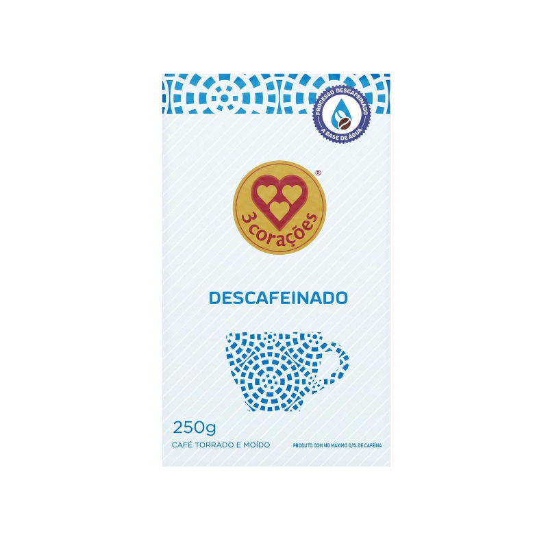 O café descafeinado 3 Corações em pó, torrado e moído, possui sabor bem delineado, com brilho instigante e notas ácidas. Leva grãos de reduzido teor de cafeína (máximo 0,1%), o que faz dele uma excelente opção para quando bater a vontade de um cafezinho, seja sozinho, em família ou com os amigos. Bastante suave, é embalado a vácuo e pesa 250 gramas.