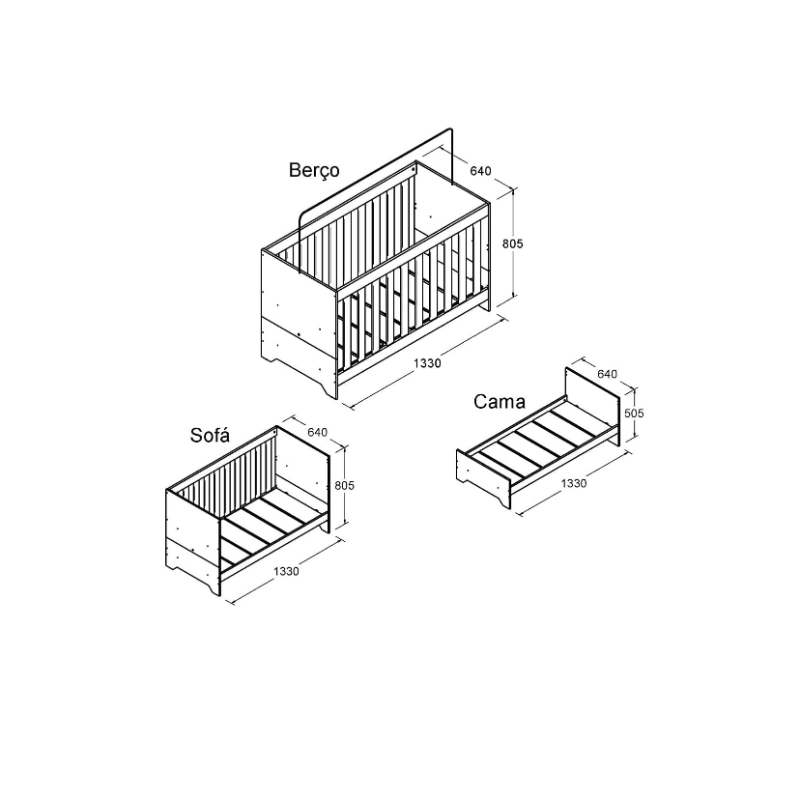 O Berço Ditália Multifuncional 3x1 pode ser utilizado como berço, oferecendo segurança ao bebê em seu próprio quarto. Quando a criança começa a se locomover com facilidade, o berço pode ser transformado em uma confortável minicama, que permite que a criança tenha sua própria cama em tamanho adequado. Além disso, o Berço multifuncional pode ser convertido em um sofá aconchegante, perfeito para reunir os amiguinhos e oferecer um espaço de diversão no quarto. CARACTERÍSTICAS - Grades: MDF - Estrutura: MDP - Bordas: Arredondadas - Acabamento: Fita bordo melamínica - Lastro: MDF com regulagem de altura - Sapatas: Deslizantes - Possui 2 regulagens de altura ideal para acompanhar o crescimento da criança - Tamanho do colchão: 130x60 cm - Acompanha colchão - Acompanha suporte para mosquiteiro - Peso: 25 kg - Altura: 80,5 cm - Largura: 64 cm - Profundidade: 133 cm - Certificado pelo INMETRO: 002814/2021 1 - O produto é entregue montado? Resposta: Nossos produtos são entregues desmontados. Os móveis são acompanhados de todos componentes necessários (manual de montagem, parafusos, pregos, puxadores e etc..) para que possam ser montados com facilidade. 2 - Vocês oferecem serviço de montagem? Resposta: Não disponibilizamos este serviço. 3 - O colchão acompanha o produto? Resposta: Sim, o colchão acompanha o produto. 4 - Qual tamanho de colchão deverá ser utilizado no Berço? Resposta: 130x60cm.