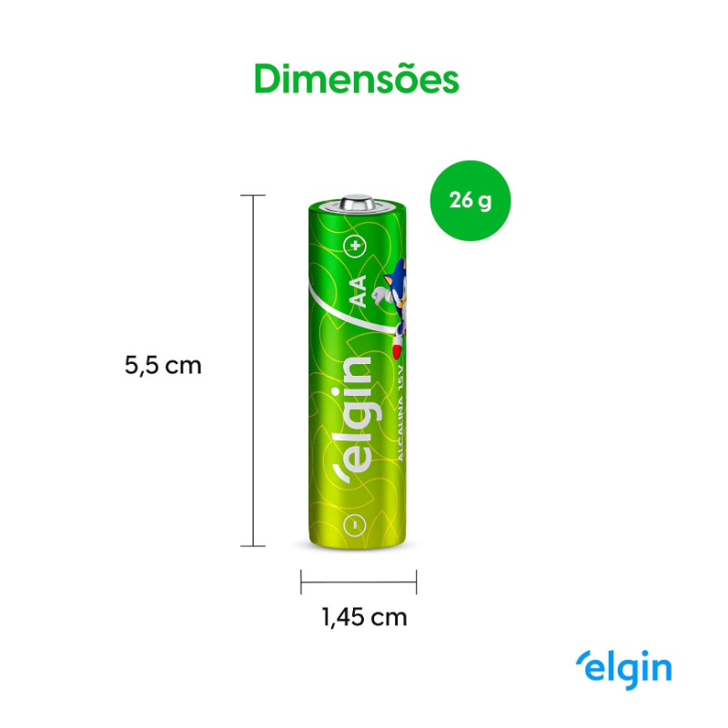 As pilhas Alcalinas Elgin são parceiras Sonic the Hedgehog, ideais para brinquedos, controle remotos, lanternas e outros aparelhos que requerem descargas de energia rápidas e fortes. Elas foram aprovadas em todos os quesitos e têm ótima relação custo/benefício, você economiza e ainda conta com pilhas de alta qualidade. Entre 11 marcas de pilhas do mercado avaliadas em testes do INMETRO, as pilhas Elgin apresentaram um resultado excelente na relação custo por hora útil. Além disso, elas são testadas periodicamente por laboratórios credenciados pelo INMETRO, para garantir a qualidade e conformidade com a resolução Conama 401.