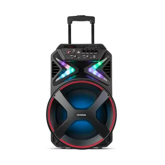 Conta com conexão Bluetooth, entrada para instrumentos musicais e USB. Seu display é digital, o que facilita o controle e a visualização dos detalhes das músicas. Inclui rádio FM, alça e rodas para transporte, além de bateria interna recarregável.