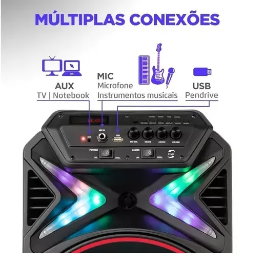 - Múltiplas conexões para microfone, Pen Drive, MP3, MP4 e instrumentos musicais