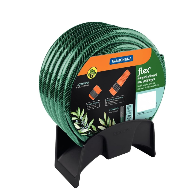 Mangueira Flex Tramontina com Engates Rosqueados e Esguicho em PVC Verde 20 M com Suporte Mural.Leve cuidado e bem estar para as tarefas do dia-a-dia com a Mangueira Flex Tramontina com Engates Rosqueados e Esguicho em PVC Verde 20 M com Suporte Mural da Linha Sweet Garden.Ideal para a manutenção de hortas e jardins, ela possui engates rosqueados e esguicho com jato regulável. É uma mangueira de 20 metros de comprimento produzida em PVC verde, material que garante flexibilidade e resistência.Ela ainda vem com suporte manual, para armazenar e guardar seu produto com mais praticidade.