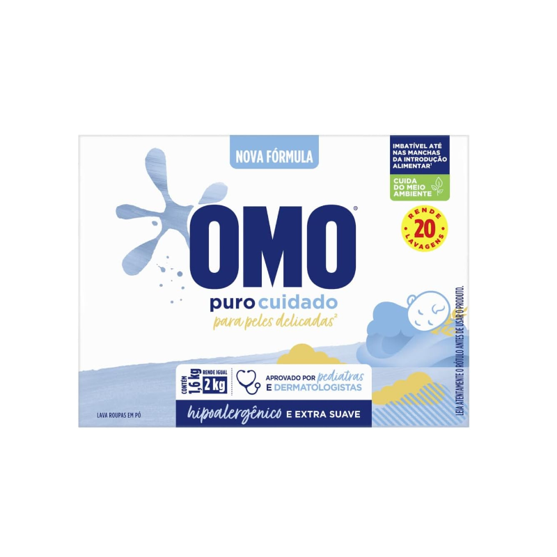 O Sabão em Pó OMO Puro Cuidado foi especialmente formulado para cuidar das roupas sem agredir as peles mais delicadas**. Avaliada por pediatras, sua fórmula é hipoalergênica e extra suave, respeita as peles mais delicadas enquanto combate as manchas mais profundas. É perfeito para lavar as roupinhas do seu bebê. O lava roupas OMO Puro Cuidado é imbatível nas manchas da introdução alimentar* e cuida do meio ambiente, pois sua fórmula contém ingredientes biodegradáveis e não possui fosfato, ajudando a preservar rios e oceanos, além de economizar água, uma vez que precisa de apenas 1 enxágue. Além disso, possui ativo concentrado, tecnologia que cuida do planeta. Menos CO², menos poluição. Por isso, apenas meia xícara lava uma máquina cheia. Faça o descarte consciente. Quando você escolhe OMO, você escolhe um mundo melhor. Juntos, sOMOs a transformação positiva para o meio ambiente. Seu uso é recomendado por Brastemp e Consul. Para saber mais sobre a linha de produtos OMO, OMO Tira Manchas e OMO Desinfetantes, acesse o site. Mantenha o produto fora do alcance de crianças e dos animais domésticos. Leia o rótulo antes de usar o produto. *Comparado com detergentes em pó do mesmo fabricante. Manchas como mamão, suco de tangerina e papinha de cenoura.** Desenvolvido para lavar roupas de pessoas com pele delicada.