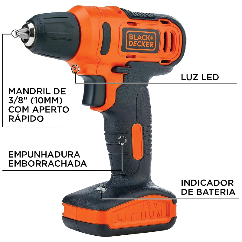 LD12SP-BRA Furadeira Parafusadeira 3/8" bateria 12 volts com 13 acessórios LD12SP da Black Decker é Ideal para uso em trabalhos rotineiros, instalações, montagens e manutenções.