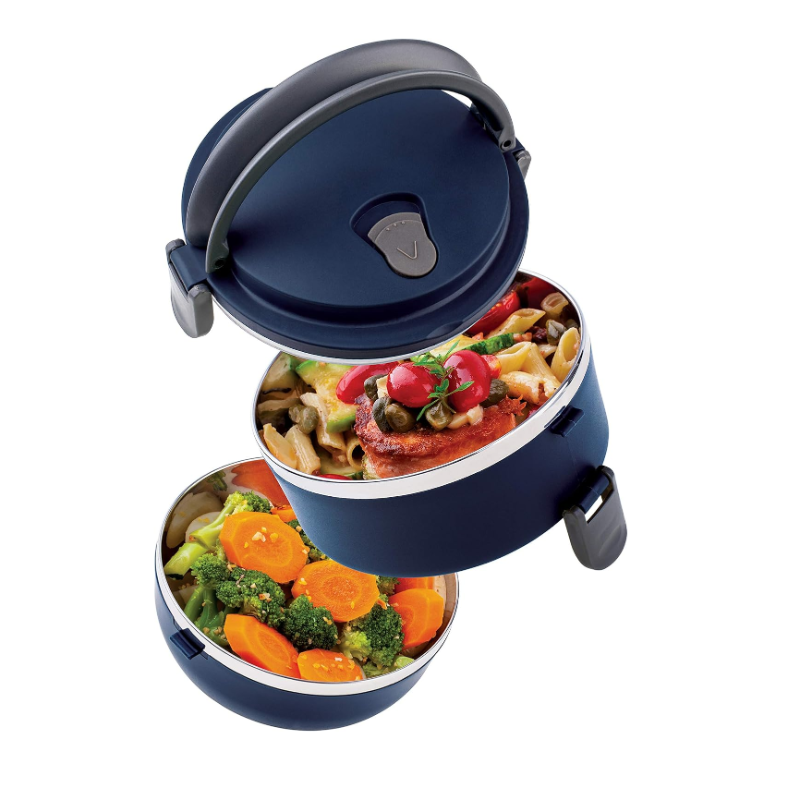 a marmita Lunch box da euro home foi desenvolvida para que você leve o sabor e a saúde da comida feita em casa para qualquer lugar. Seu interior é feito em aço inox, um material que não solta resíduos e mantém o sabor original dos pratos. Seus dois compartimentos de 700 ml são fechamentos hermeticamente com um anel de silicone, o que garante uma proteção extra para os alimentos. a marmita vai ao freezer e possui uma alça que facilita o transporte. Possui também uma tampa com saída de vapor.