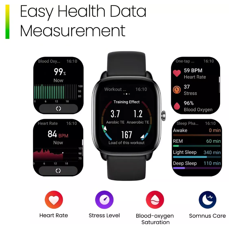 Este facilmente sua frequência cardíaca, saturação de oxigênio no sangue e nível de estresse simultaneamente com um único toque do smartwatch, para um resultado em até 45 segundos. Além disso, este relógio oferece monitoramento profundo da qualidade do sono para manter você no topo da sua saúde.