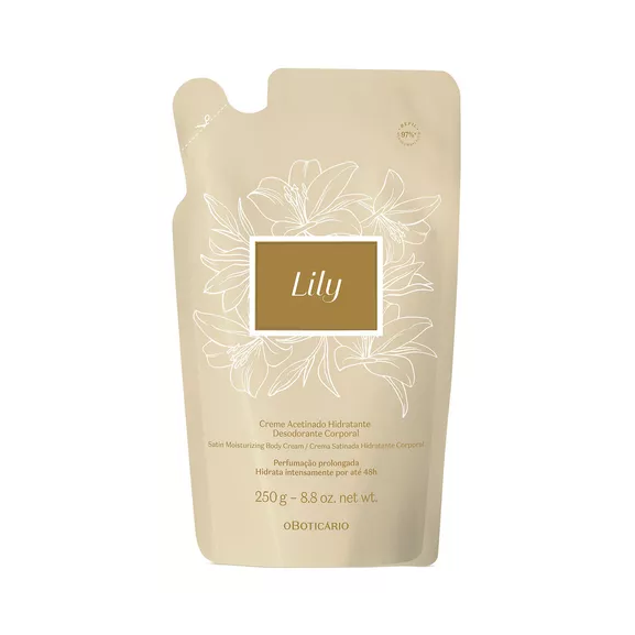 O Refil Creme Acetinado Desodorante Hidratante Corporal Lily proporciona uma perfumação duradoura e uma fragrância intensa para a pele.