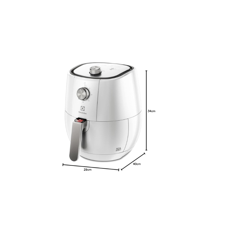 Para deixar sua cozinha mais prática, moderna e otimizar o tempo na hora de preparar suas refeições, a AirFryer Fritadeira Elétrica Electrolux é o aparelho ideal. Equipada com controle de temperatura intuitivo, ela permite selecionar a temperatura de forma simples, garantindo a segurança de ter os alimentos preparados sempre na temperatura correta, com redução de quase 50% de calorias¹ e quase 90% menos gorduras ao final do processo². Para oferecer ainda mais praticidade, a Fritadeira sem óleo conta com timer sonoro, que indica quando a receita está finalizada. O cesto removível e antiaderente permite que seja feita uma limpeza prática e eficiente. O painel com receitas pré-sugeridas conta com indicador de tempo e temperatura ideias para atingir deliciosos resultados em receitas conhecidas. O indicador luminoso de funcionamento permite maior segurança e certeza de que a Airfryer está em funcionamento. Com o desligamento automático, seus alimentos não passarão do ponto, pois passado o tempo pré-definido no timer, ela desliga automaticamente. O cesto possui 3,2 Litros de capacidade dedicada ao uso, e conta com uma cuba de 4 Litros. Além disso, a potência de 1400W é ideal para suas preparações. Seu design também ajuda a complementar a beleza de sua cozinha. ¹Testes realizados por nutricionista, com iscas de peixe empanado (250g) de tilápia e duas formas de preparação: fritura convencional (utilizando 828g de óleo de girassol) e na airfryer (utilizando 2g de azeite). O resultado demonstrou a redução de 48,6% de calorias quando preparados na AirFryer. ² Testes realizados por nutricionista, com iscas de peixe empanado (250g) de tilápia e duas formas de preparação: fritura convencional (utilizando 828g de óleo de girassol) e na airfryer (utilizando 2g de azeite). O resultado demonstrou a redução de 89,4%% de gordura quando preparados na AirFryer.