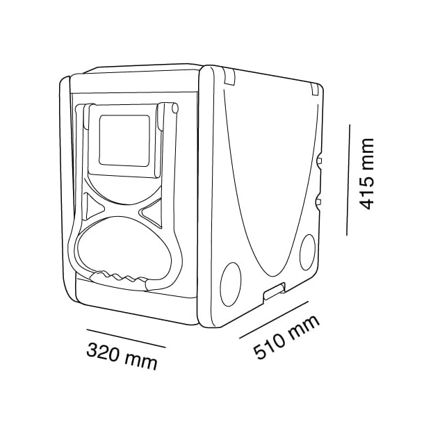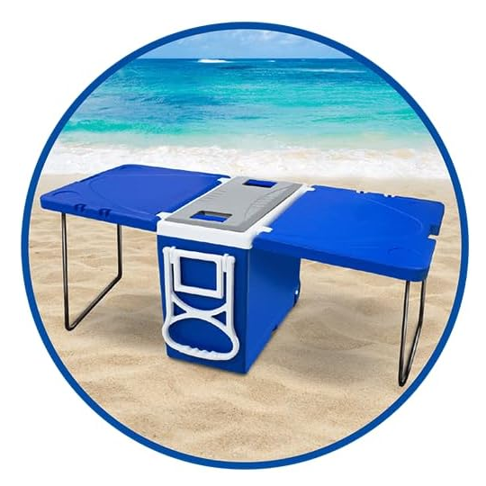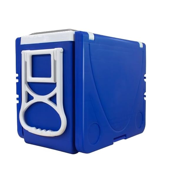 Caixa Térmica Multifuncional 32 litros 3 em 1, alças laterais, cooler térmico, rodas, tampa com travas. Possui 2 mesas com suporte para sacolas. Produzido em polipropileno. Dimensões: 51cm X 32cm X 41,5cm. Cor: Azul.