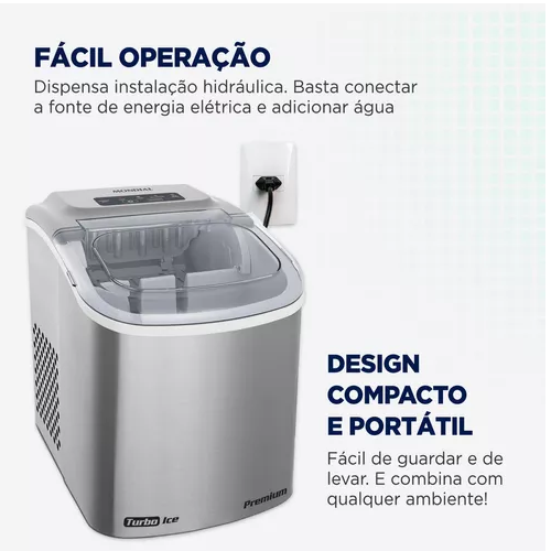 A Máquina de Gelo Turbo Ice Premium é sinônimo de praticidade e sofisticação na produção de gelo. Com capacidade de produzir até 12 kg por dia, ela é ideal para bebidas e drinks refrescantes no almoço de família, churrasco com amigos e até na rotina diária nos dias mais quentes. Possui design moderno e dispensa instalação hidráulica, preparando gelo com facilidade em menos de 10 minutos.