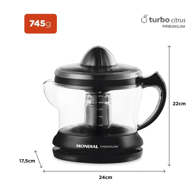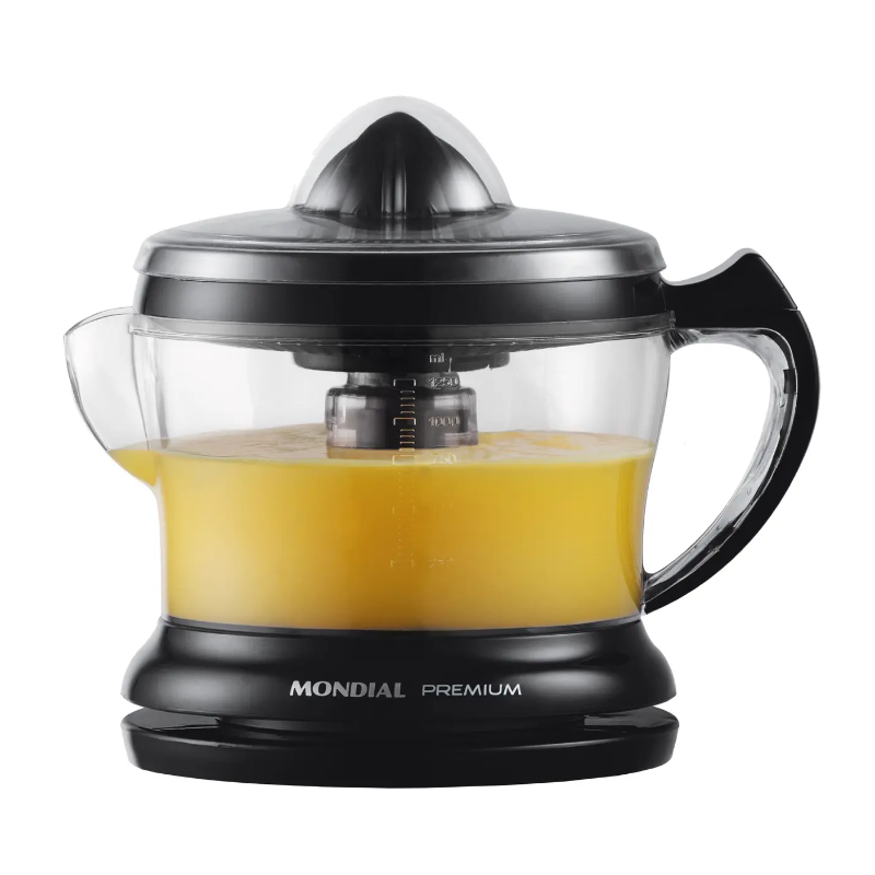 Este Espremedor de Frutas E-02 Premium da Mondial possui alto padrão de eficiência e qualidade, garantindo o preparo de deliciosos sucos. A sua jarra tem capacidade para 1,25L e é transparente para facilitar a visualização. Seus 2 cones facilitam o preparo, cada um para um tipo diferente de fruta, laranja ou limão. Com potência de 30W, sua dupla rotação e acionamento automático ajudam a espremer 100% do extrato da fruta. Além do porta-fio na base que permite ajustar o tamanho do cabo para o uso, facilitando também seu armazenamento. Produzido em polipropileno na cor preta, ganha destaque na qualidade, no design moderno e na excelente relação custo x benefício.