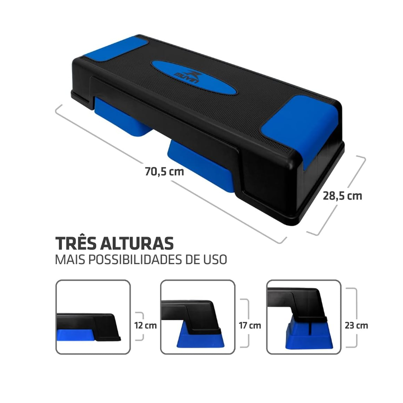 Fora isso, ao utilizar o step é possível melhorar o condicionamento cardiorrespiratório, desenvolver coordenação e ritmo, aumentar a resistência muscular e fortalecer ossos, tendões e ligamentos. O step da Muvin possui a base no tamanho de 70,5cm x 28,5cm e pode ter a sua altura ajustada. São três alturas possíveis: 12cm, 17cm e 23cm. Isso possibilita que os exercícios sejam diversificados com intensidades diferentes.
