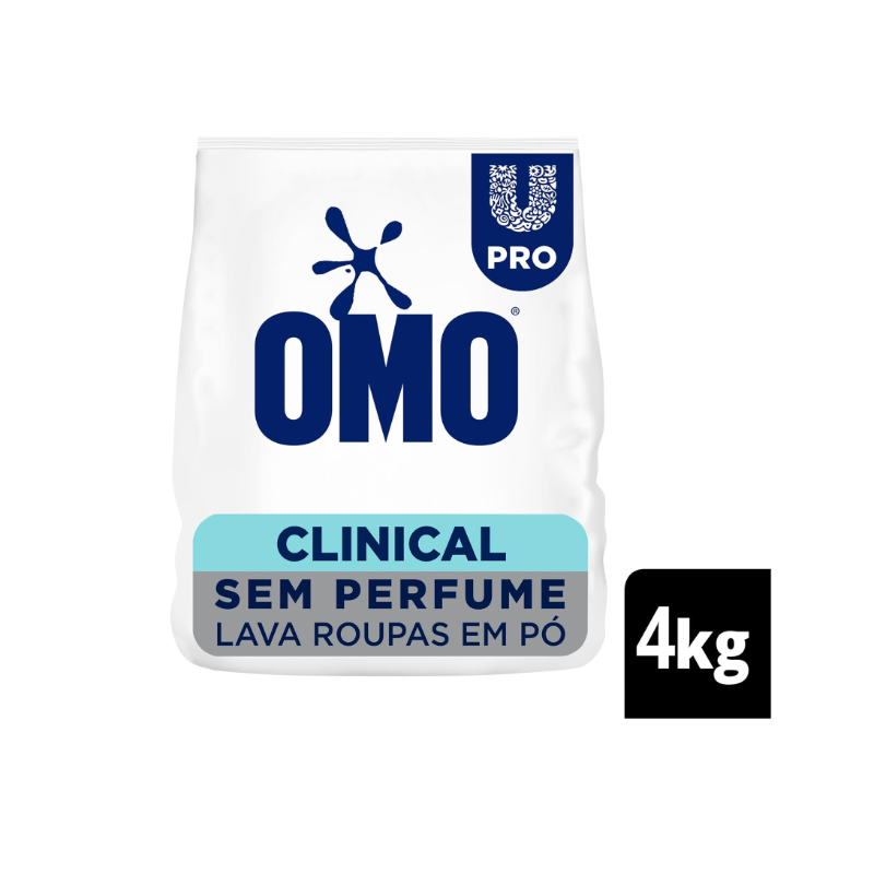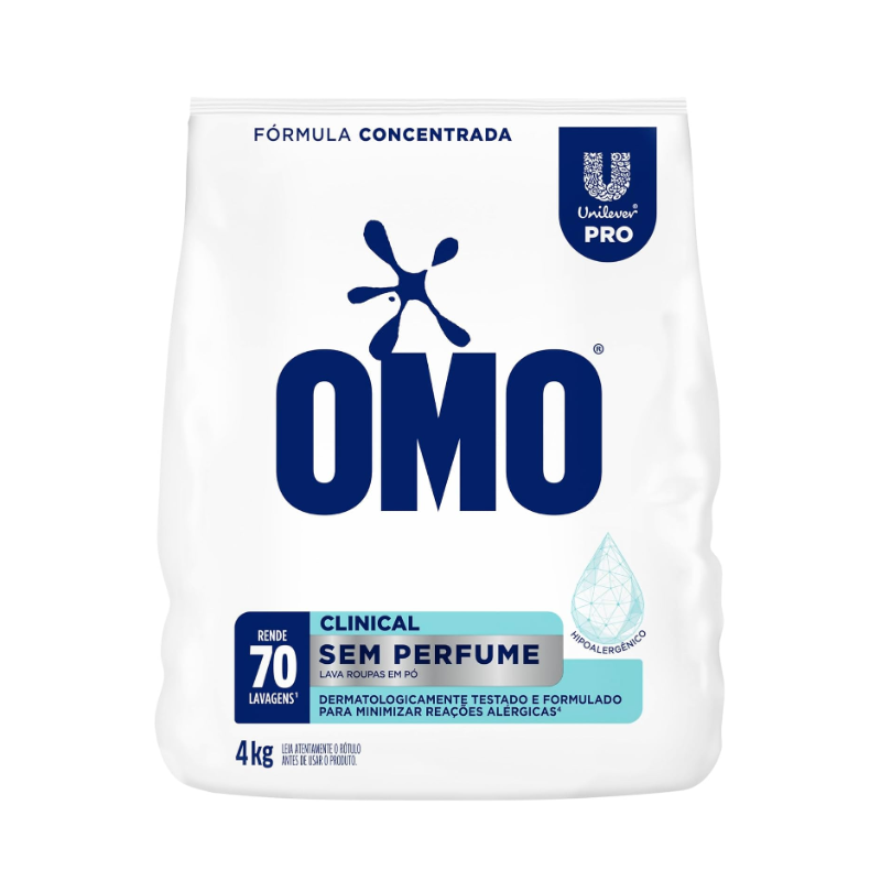 O Lava Roupas em Pó OMO Lavanderia Profissional Clinical foi criado para facilitar o dia a dia dos profissionais de saúde. Este sabão em pó, sem fragrância, possui um magnífico poder de limpeza e formulado para minimizar reações alérgicas e irritações da pele. Este lava roupas em pó tira manchas de primeira** e limpa profundamente roupas brancas e coloridas. Ele atua profundamente nas fibras dos tecidos para higienizar as peças e eliminar as manchas. O detergente em pó OMO Clinical possui a fórmula com pó ultrafino de rápida dissolução, que garante alto desempenho de lavagem. Muito versátil, ele pode ser usado tanto para a limpeza de tecidos brancos, quanto coloridos, já que não possui ingredientes que danificam as roupas***. Use-o para revitalizar roupas, lençóis, toalhas, cobertores, uniformes, entre muitos outros tecidos. Sua tecnologia faz dele um sabão como o de lavanderias profissionais: na dosagem correta, 4 kg rende até 70 lavagens*. OMO Clinical é um produto lava roupas hipoalergênico, com pH balanceado e dermatologicamente testado. Para um melhor resultado de perfume e maciez, use Comfort Lavanderia Profissional. *Rendimento calculado seguindo recomendação de uso para sujeira moderada. Máquina de capacidade 11 kg. **Manchas de isotônico, clorexidina e complexo B, em tecido de algodão. Teste realizado seguindo recomendação de uso para sujeira extrema. Máquina de capacidade 11 kg. ***Fórmula sem ingredientes que possam danificar os tecidos, como percarbonato de sódio e peróxido de hidrogênio. ****Produto desenvolvido para lavar roupas de pessoas com pele delicada.