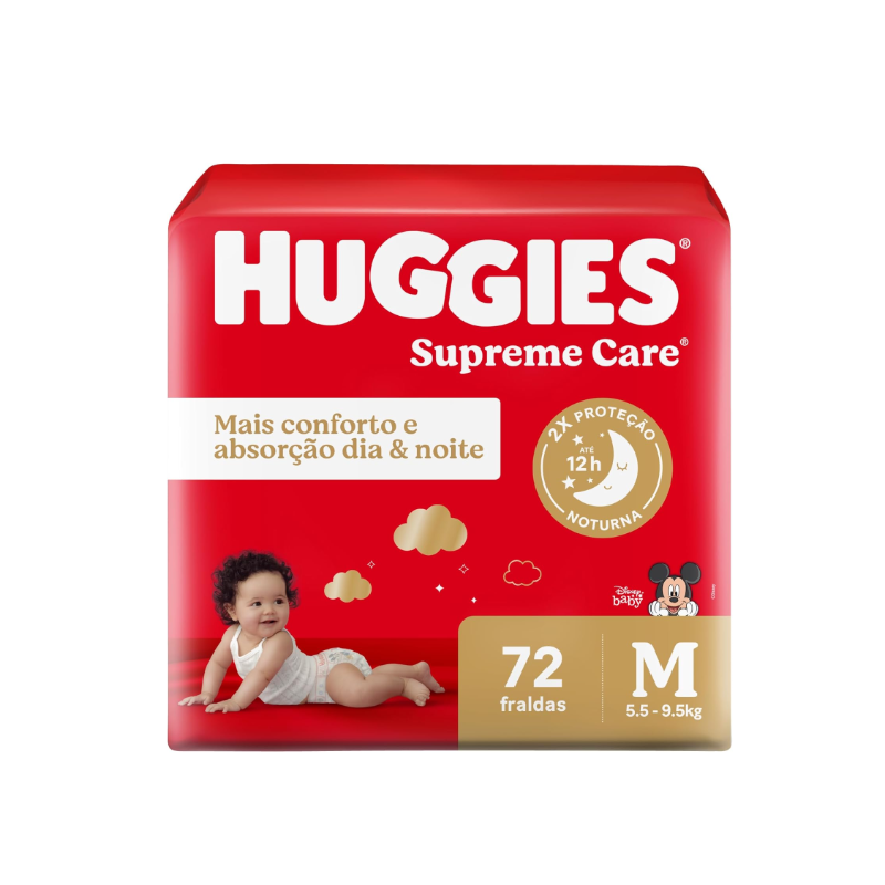A Supreme Care é a companhia perfeita para você que busca máxima proteção enquanto seu bebê se movimenta. Com uma suavidade mais macia do que nunca, especialmente na parte traseira, proporciona conforto e absorção ideais, mantendo seu bebê sempre sequinho. Graças à sua tecnologia exclusiva, a Supreme Care é a única com canais em formato de X, adaptando-se para oferecer mais liberdade de movimento, com uma anatomia que se adapta aos movimentos do seu bebê. Com ajustes elásticos na cintura, barreiras e orelhas elásticas para máxima flexibilidade e conforto, oferece duas vezes mais proteção noturna comparada às fraldas Huggies sem a tecnologia Xtra-Flex. Além disso, sua cintura com indicadores alerta o momento ideal para trocar de tamanho, proporcionando tecnologia superior com mais conforto e absorção tanto durante o dia quanto à noite, em comparação com fraldas tradicionais Huggies.