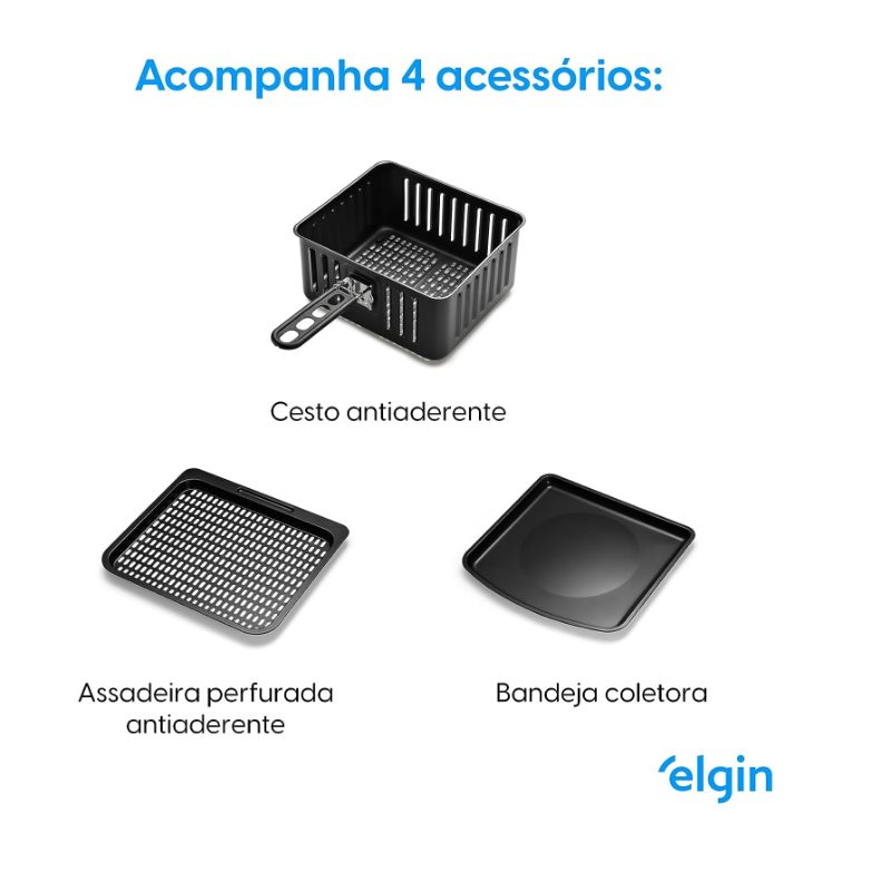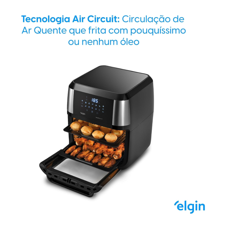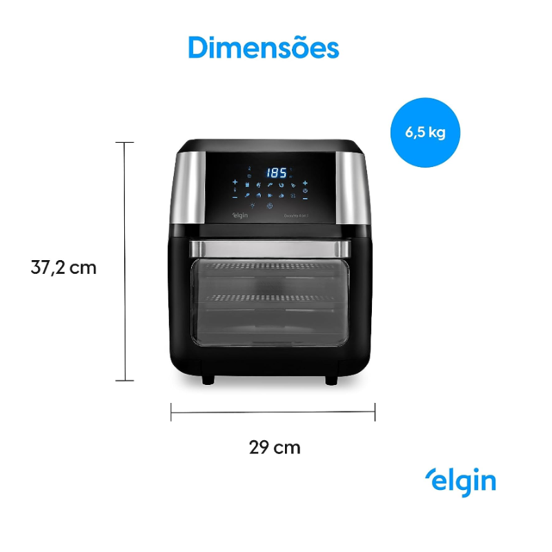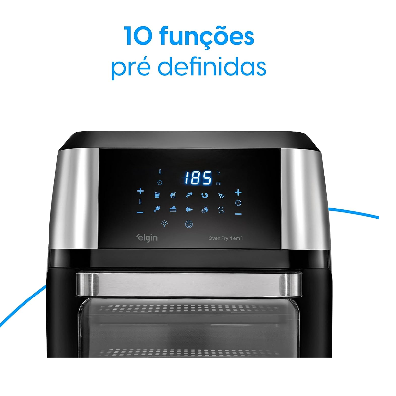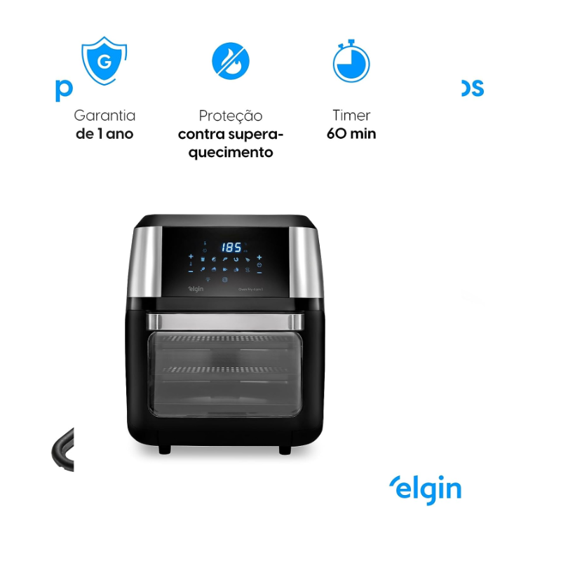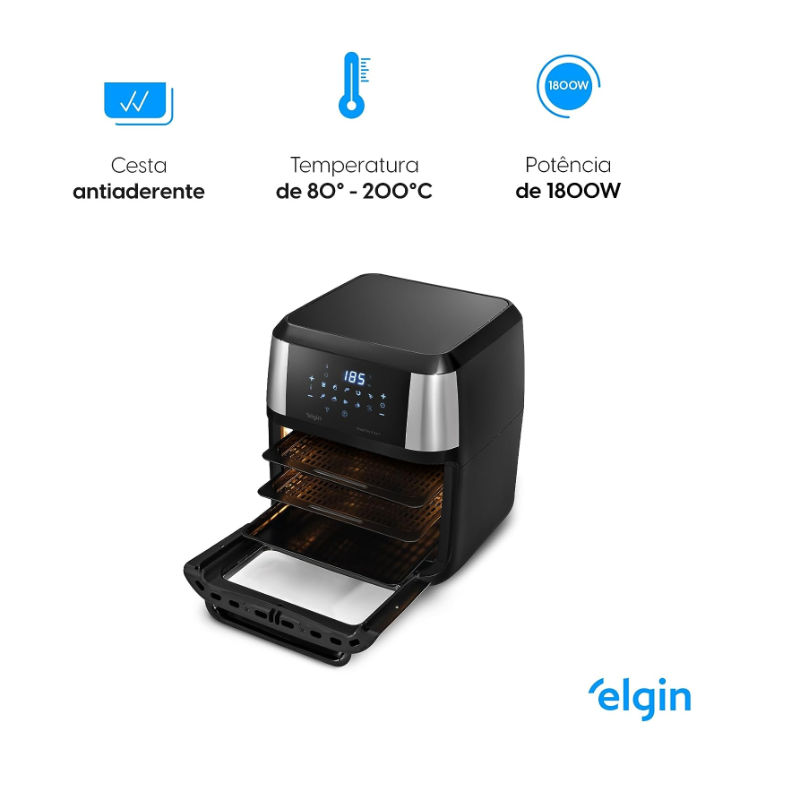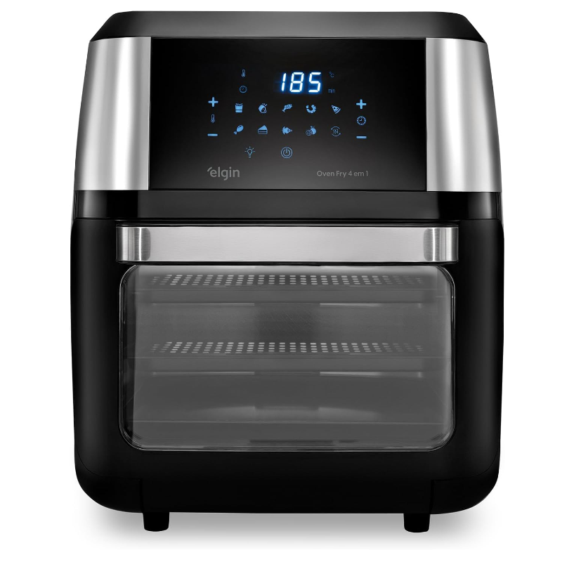 A Fritadeira Elétrica e Forno Oven fry da Elgin é tudo o que você precisa para fazer refeições mais leves e saudáveis no dia a dia. A Oven Fry é 4 em 1: assa, frita sem óleo, desidrata e reaquece. Seu design é moderno e compacto com detalhes do acabamento em inox. Tem capacidade para até 12 litros e potência de 1800w que garante uma refeição rápida e saborosa. Possui painel touch com Seletor de Temperatura digital de 0ºc a 200ºc e 10 opções de preparo pré-definidas. A função desidratar tem tempo ajustável de 1:30 a 24 horas e timer sonoro de até 90 minutos com desligamento automático. O visor da porta e a luz interna permitem acompanhar o preparo do alimento durante todo o tempo. A Fritadeira possui tecnologia Air Circuit que proporciona circulação homogênea do ar quente ultrarrápido. Acompanha um cesto antiaderente de 4,6 litros, bandeja assadeira, bandeja para grelhados e bandeja de fritura ou coletora. A porta é removível e as bandejas podem ir na lava-louças, super fácil de limpar! Ainda conta com proteção contra superaquecimento e controle de temperatura de 80°c a 200°c. possui base antiderrapante e alça fria que facilitam o uso. A Elgin oferece garantia expressa de 1 ano para você usar sua fritadeira sem preocupação.