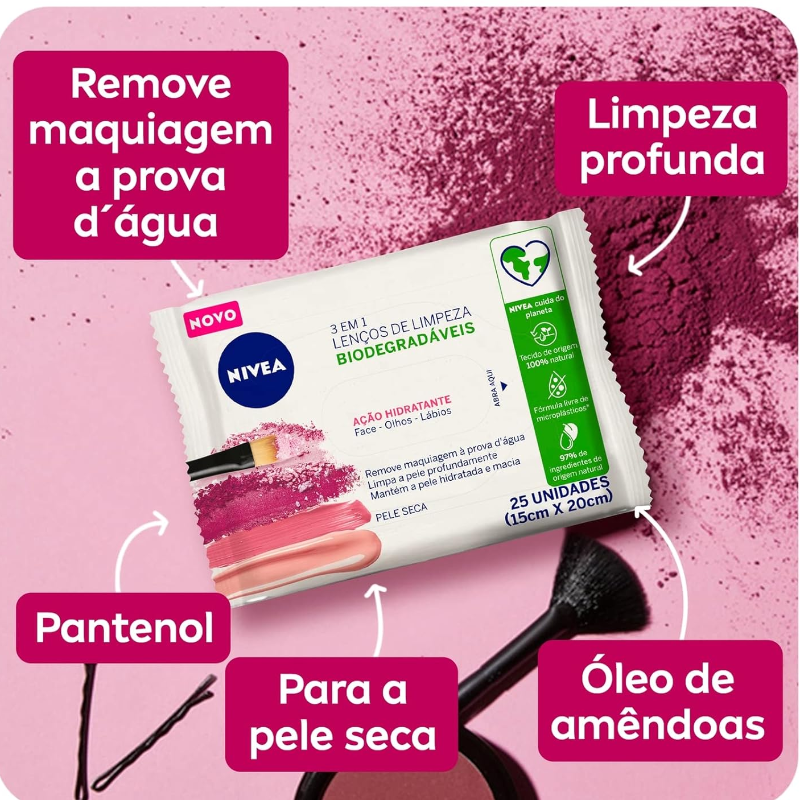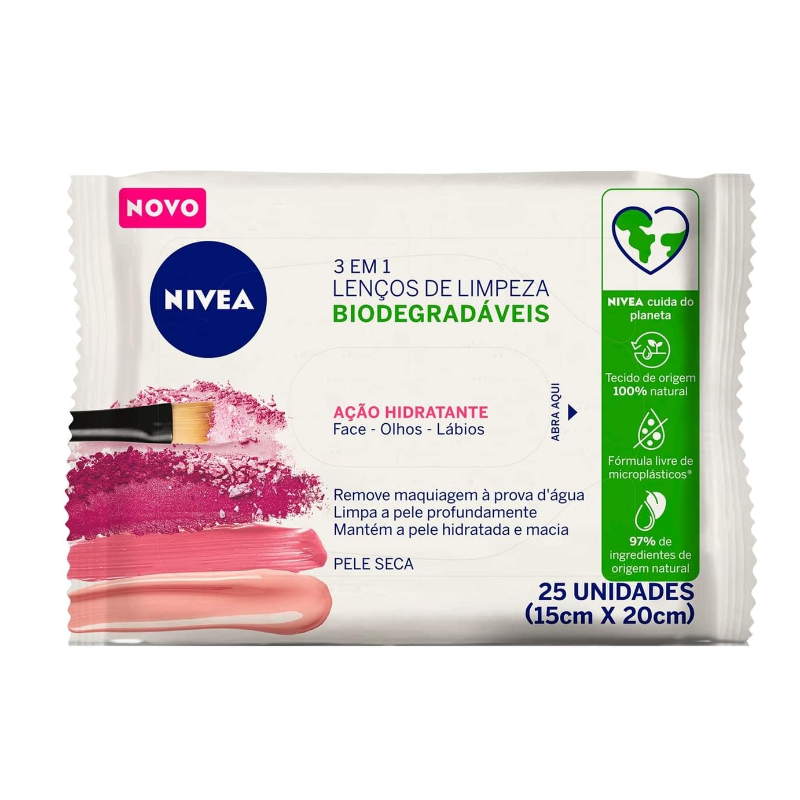 O que é? NIVEA Lenço de Limpeza Facial Demaquilante Ação Hidratante 3 em 1 é essencial para cuidados com a pele e limpeza profunda. Para que serve? Práticos e eficazes, os lenços removem impurezas e maquiagem à prova d'água, limpando, hidratando e revitalizando a pele. Sua fórmula inovadora com óleo de amêndoas não possui álcool etílico, o que deixa a pele mais suave. Você pode usar no rosto, pescoço e colo e não há necessidade de lavar o rosto após uso. Com NIVEA Lenço de Limpeza Demaquilante Ação Hidratante 3 em 1, obtenha pele limpa, hidratada e radiante. Experimente esse cuidado e praticidade na sua rotina de cuidados com a pele.
