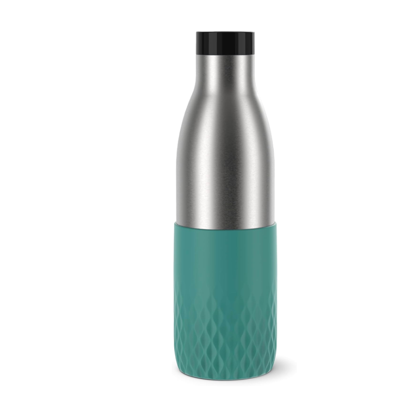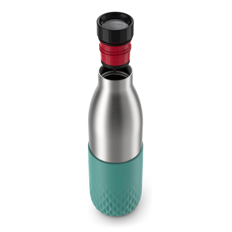 Sua bebida na temperatura ideal com apenas um ""clic"" usando a Garrafa Térmica Tefal Bludrop Verde 700ml, que mantém sua bebida por até 24h fria ou 12h quente. Esta garrafa, feita de aço inoxidável durável com acabamento em silicone, não só oferece estilo, mas também muito mais firmeza e segurança no seu dia a dia. Design feito 100% à prova de vazamentos, torna o transporte fácil e sem preocupações. Botão abre e fecha fácil com apenas um ""clic"", centralizado na tampa para não entrar em contato com a sua bebida. Diferenciais: - Mantém sua bebida 24h fria ou 12h quente. - Abre fácil, com apenas um ""clic"" - À prova de vazamentos. - Acabamento em silicone, muito mais firmeza. - Compatível com máquina de lavar louças. - Aço inoxidável: Material com isolamento térmico e resistente. - Fácil de limpar: Tampa totalmente desmontável. Desfrute da praticidade e elegância, garantindo que sua bebida esteja sempre na temperatura ideal em um ""clic"" com a Garrafa Térmica Tefal Bludrop Verde de 700ml.