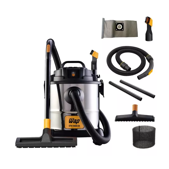 Seus acessórios incluem bicos para carpetes, pisos frios e cantos, além de um bocal de sopro útil para infláveis e churrasqueiras. O WAP GTW Inox 20 é prático, robusto e perfeito para quem precisa de uma solução eficiente para o dia a dia, mantendo a tradição de qualidade da linha WAP no mercado profissional.