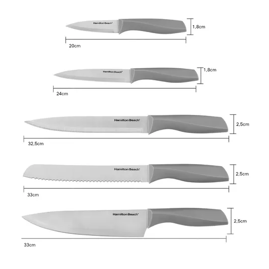 Apresentamos o Conjunto de Facas Hamilton Beach, um kit minimalista, prático e funcional. Temos cinco facas incríveis que vão simplificar sua vida. Do Chef, de Pães, Carnes, Vegetais e para Descascar, prontas para todas as suas necessidades na cozinha.