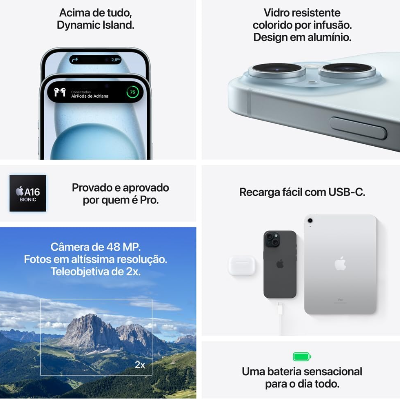 - DESIGN INOVADOR — O iPhone 15 tem vidro resistente colorido por infusão e design em alumínio. Ele aguenta o tranco contra respingos, água e poeira. A parte da frente em Ceramic Shield é mais resistente que qualquer vidro de smartphone. E a tela Super Retina XDR de 6,1 pol. é até duas vezes mais visível sob o sol em comparação com o iPhone 14.