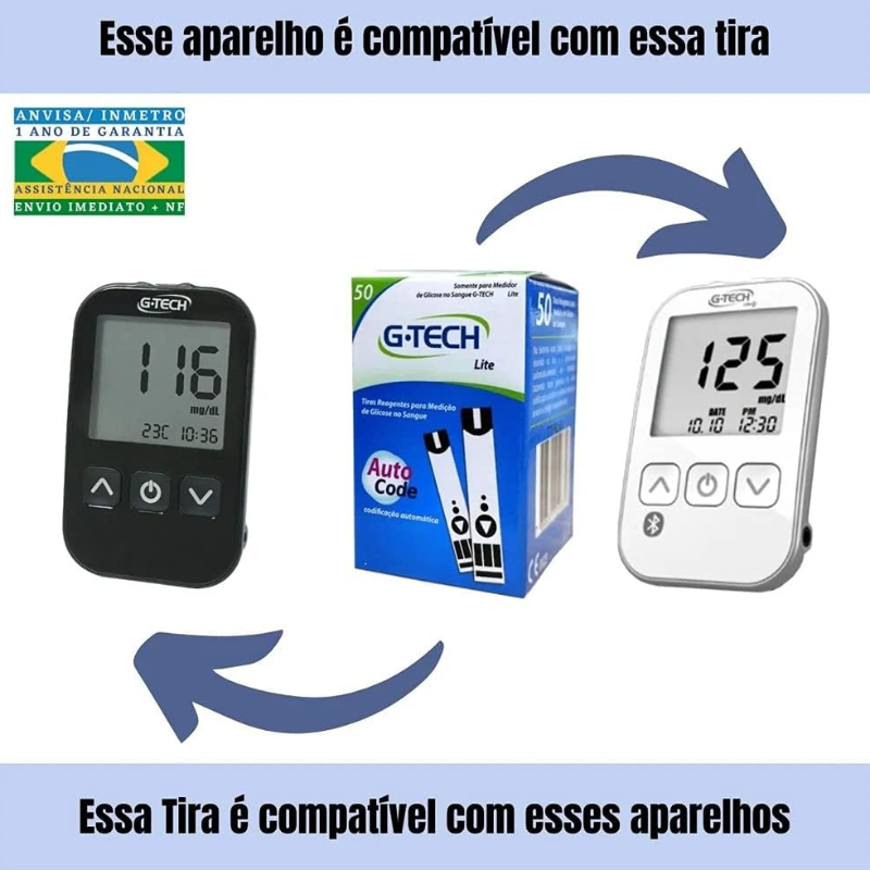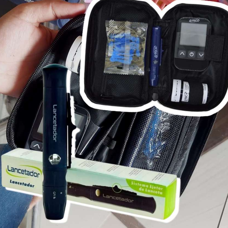 KIT COMPOSTO POR: 01 Medidor de Glicose G-tech Lite 01 Caneta Lancetadora 10 Tiras de Teste G-tech Lite 10 Lancetas 01 Bateria CR2032 01 Estojo