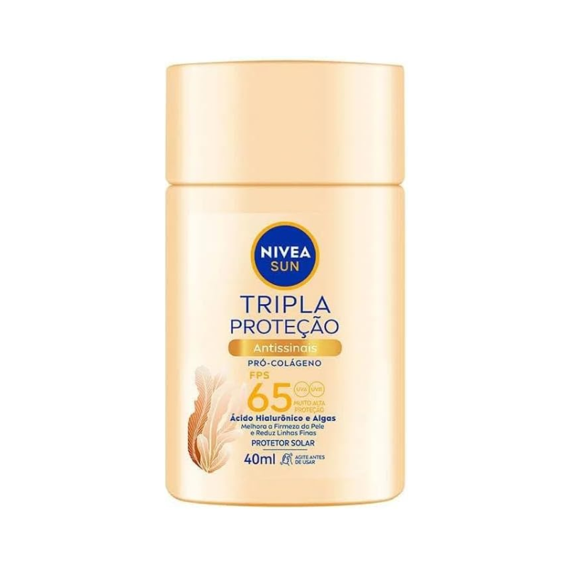 O que é? O novo Protetor Solar Tripla Proteção Fluido Antissinais tem Fórmula ultraleve e muito alta proteção solar. FPS 65 protege dos raios UVA/UVB, combate radicais livres causados pela poluição, ainda uniformiza a pele e reduz linhas finas. Para que serve o NIVEA Sun Facial Tripla Proteção Fluido Antissinais FPS 65? Cuidado intensivo diário de triplo combate contra: Raios UVA / UVB. Radicais livres causados pela luz visível. Poluição. Garante efeito de pele renovada em 4 semanas. Reduz rugas e linhas de expressão, mesmo na área dos olhos. Aumenta a produção de colágeno. Textura ultraleve, fórmula com algas marinhas e não interfere na duração da maquiagem. Benefícios e diferenciais - FPS 65 Alta Proteção Solar - Fórmula com algas marinhas - Textura ultraleve - Garante efeito de pele renovada em 4 semanas - Aumenta a produção de colágeno - Não interfere na duração da maquiagem - Extra resistência à água e ao suor - Reduz rugas e linhas de expressão, mesmo na área dos olhos Como usar o NIVEA Sun Facial Tripla Proteção Fluido Antissinais FPS 65? Agite antes de usar. Aplique abundantemente antes da exposição ao sol. Reaplique o produto a cada 2hrs ou depois de transpiração excessiva ou mergulho na água. DICA: Oferece muito alta proteção contra queimaduras solares e é indicado para pele extremamente sensível à queimadura solar. CUIDADO: Filtros solares em contato com o tecido podem causar manchas. Uma unidade contém 40ml