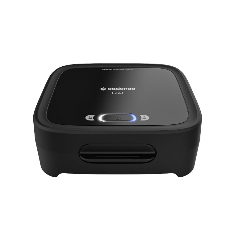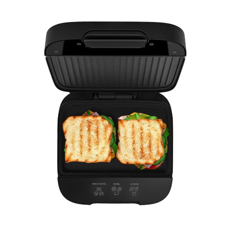 A Sanduicheira Click tem um design único e formato inovador. É a companheira bancada para fazer de tudo um pouco! - Botão Liga/Desliga com LEDs indicadores. - Não precisa tirar da tomada. - Pés firmes. A sanduicheira não tomba. - Chapas Antiaderentes + Profundas - 80% + ESPAÇO mais versátil. - Chapas +SIMPLES DE LIMPAR - Superior grill, Inferior LISINHA!