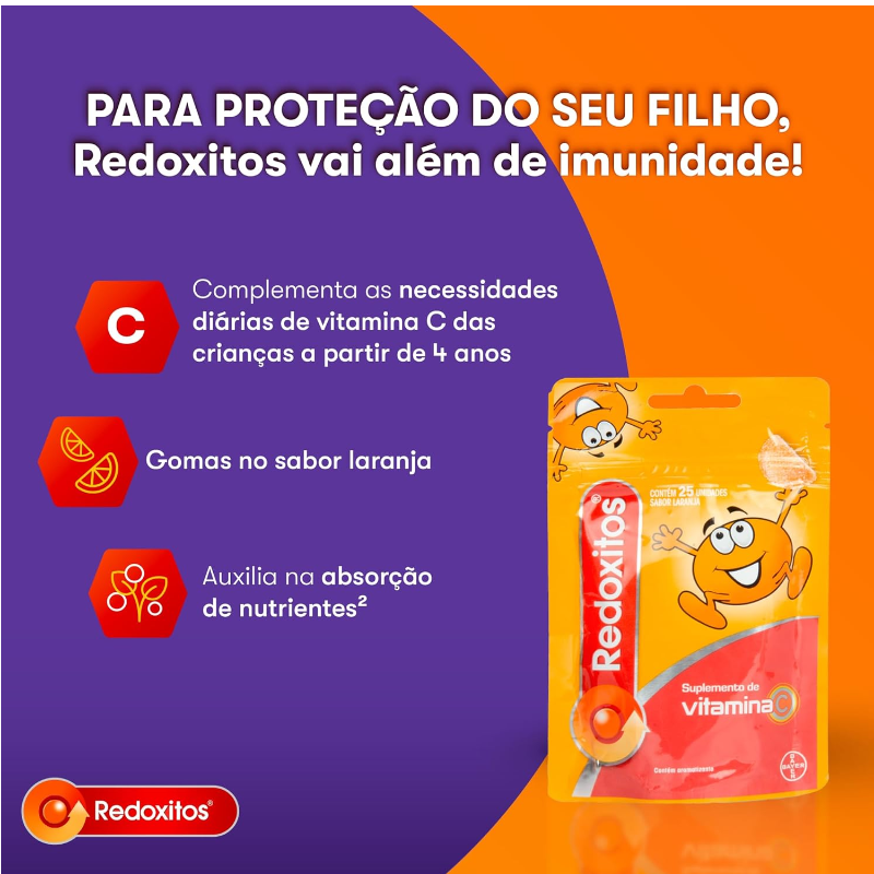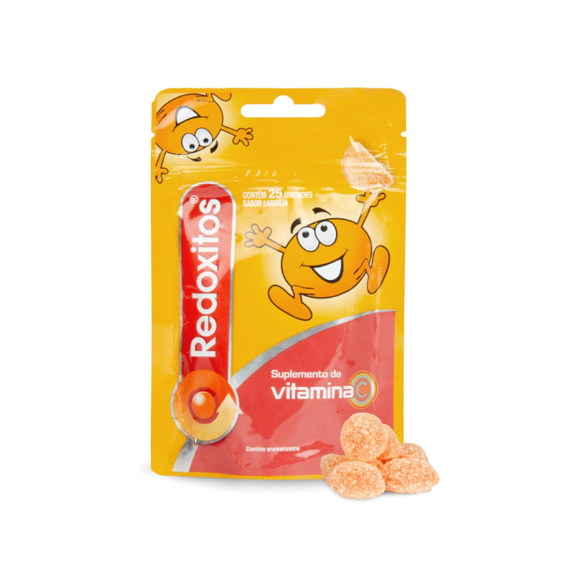 Redoxitos Vitamina C é um suplemento alimentar com sabor de laranja, ideal para ajudar na saúde, bem-estar e desenvolvimento saudável das crianças. Cada embalagem contém 25 gomas que complementam a necessidade diária de Vitamina C para crianças a partir de 4 anos. Auxilia na absorção de ferro dos alimentos e auxilia no metabolismo de proteínas e gorduras. Redoxitos. SUPLEMENTO ALIMENTAR EM GOMAS. Produto recomendado para crianças de 4 a 18 anos. ESTE PRODUTO NÃO É UM MEDICAMENTO. NÃO EXCEDER A RECOMENDAÇÃO DIÁRIA DE CONSUMO INDICADA NA EMBALAGEM. MANTENHA FORA DO ALCANCE DE CRIANÇAS. CONTÉM GLÚTEN. ALÉRGICOS: CONTÉM DERIVADOS DE TRIGO. 1 . NPS IQVIA - mar/23 - Share de prescrição: 40%. 2. A vitamina C auxilia na absorção de ferro dos alimentos. 3. Devido ao aumento da síntese de colágeno. A vitamina C auxilia na formação de colágeno. 4. Devido a ação antioxidante. A vitamina C auxilia no metabolismo energético. 5. A vitamina C auxilia no funcionamento do sistema imune. 6. A vitamina C é um antioxidante que auxilia na proteção dos danos causados pelos radicais livres.