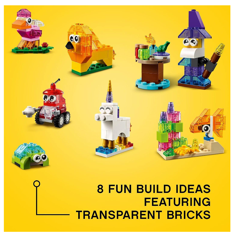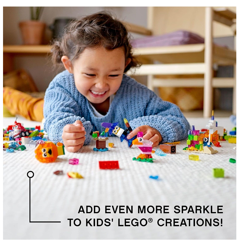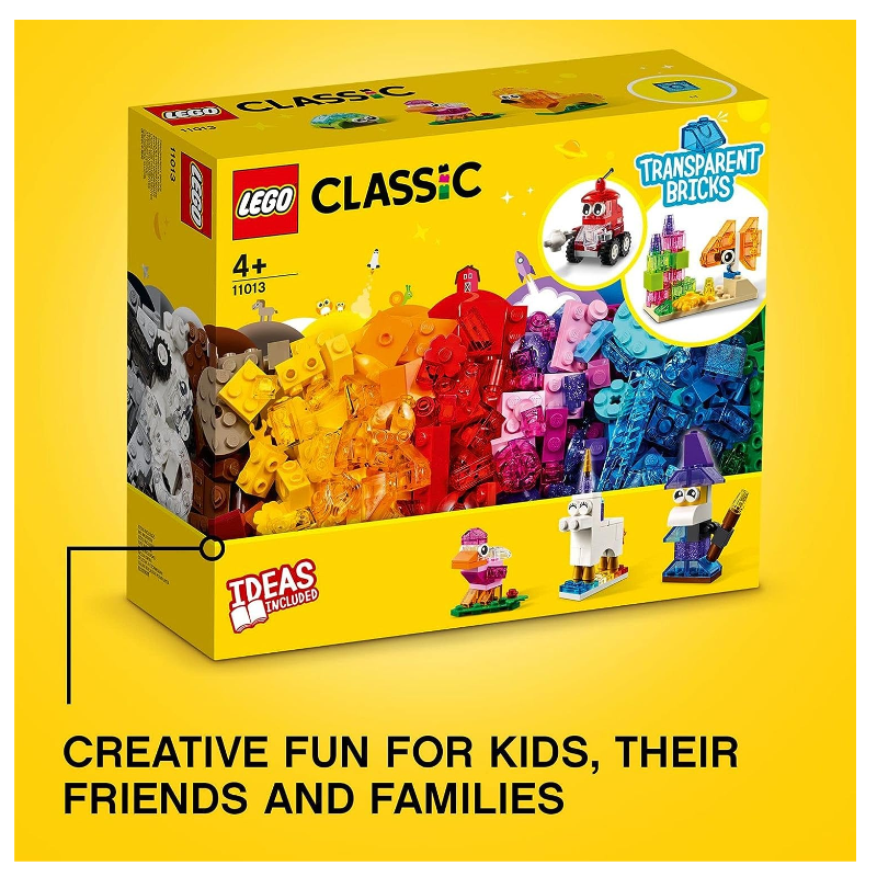 Acrescente brilho às criações LEGO® das crianças com este conjunto de Peças Transparentes Criativas LEGO Classic;lacas de estrada contém uma colorida seleção de peças LEGO translúcidas. As crianças podem escolher de entre 8 ideias de modelo reluzentes, desde um feiticeiro com seus frascos de poções até um robô brilhante que serve chá. E com peças extra na caixa, as crianças podem criar tudo o que possam imaginar, desenvolvendo habilidades cruciais para a vida enquanto constroem e brincam.