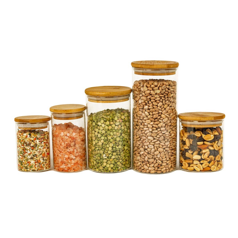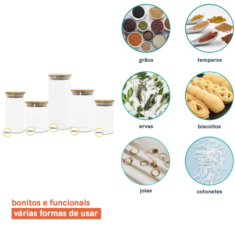Kit 5 Potes De Vidro para Mantimentos com Tampa Bambu