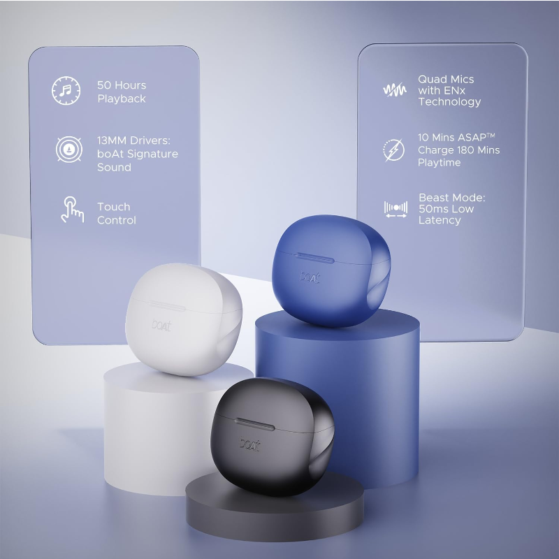 Fone de Ouvido Sem Fio Bluetooth Airdopes 170 - boAt Apresentamos os Fones de Ouvido boAt Airdopes 170 TWS, uma revolução em áudio sem fio! Com um incrível tempo de reprodução total de até 50 horas, incluindo até 9 horas por fone de ouvido, você terá música o dia todo, sem parar. E não é só isso! Com a tecnologia Quad Mics ENx™, suas chamadas de voz serão cristalinas, eliminando ruídos de fundo para uma comunicação nítida em qualquer lugar. Agora, para os amantes de jogos e entretenimento, o Modo BEAST de baixa latência garante uma experiência imersiva sem atrasos, para sessões sempre suaves. E falando em imersão, os drivers de áudio de 13 mm proporcionam uma qualidade sonora incomparável, levando você para dentro da sua música. Quando a bateria está baixa, não há problema! Com a tecnologia ASAP Charge, você pode obter até 180 minutos de reprodução com apenas 10 minutos de carregamento. E com o Bluetooth v5.3, a conexão sem fio é sempre estável, garantindo uma experiência auditiva perfeita. Além disso, a tecnologia IWP torna a conexão instantânea - basta abrir o estojo e os fones de ouvido estão prontos para uso. E tudo isso em um elegante design preto clássico que combina estilo e funcionalidade. Não espere mais, eleve sua experiência auditiva com os Fones de Ouvido boAt Airdopes 170 TWS. Principais Características: - Cor Predominante: Azul - Modo Beast™, 50 horas de reprodução. Oferece um tempo de reprodução total de até 50HRS, incluindo até 9HRS de reprodução por fone de ouvido. - Baixa Latência - Desfrute de uma experiência de jogo e entretenimento sem atrasos com o Modo BEAST para baixa latência, para que suas sessões sejam sempre tranquilas. - Microfone quádruplo com tecnologia ENx™, - Drivers de 13 mm: som exclusivo boAt, - Carga ASAP™ - Cortesia de nossa tecnologia ASAP Charge, os fones de ouvido podem acumular até 180 minutos de reprodução em apenas 10 minutos de carregamento. - Formato do microfone: Com microfone - Inclui bateria recarregável: Sim - Composição da célula da bateria: Polímero de Lítio - Recurso de cabo: Sem cabo - Tipo de conector: Bluetooth Disponível nas cores: Azul, Preto, Branco Especificações Técnicas: - Conteúdo da Embalagem: 01 Airdopes 170, cartão de garantia, borrachas de fones de ouvido adicionais, cabo de carregamento e Manual do usuário - Material: Plástico - Dimensões do produto 5,9 x 4,9 x 2,6 cm aprox. - Peso: 0,40 kg - Certificação ANATEL - Garantia: 12 Meses (Contra Defeito de Fabricação Pelo Fabricante) - Homologação: 00549-24-16456 - Referência do Fabricante: 7000000055, 7000000056, 7000000057 - EAN: 8905650021097, 8905650021103, 8905650021110 - Marca: boAt Imagens meramente ilustrativas, as cores e estampas podem variar de acordo com o lote do fabricante.