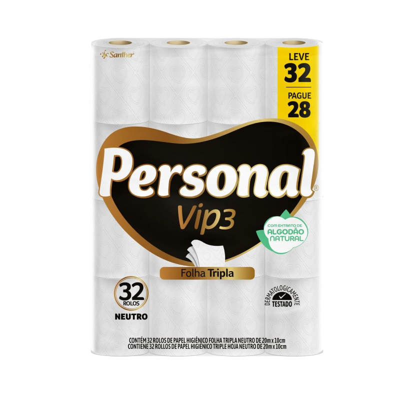 Papel Higiênico Folha Tripla Neutro com Extrato de Algodão Natural Personal Vip3 20m Pacote Leve 32 Pague 28 Unidades