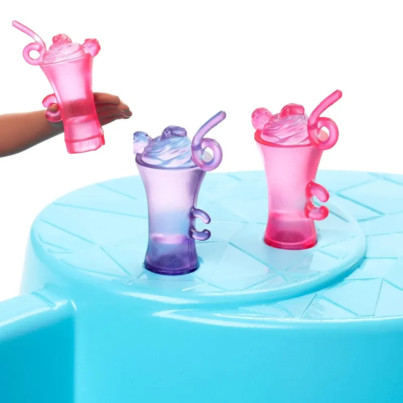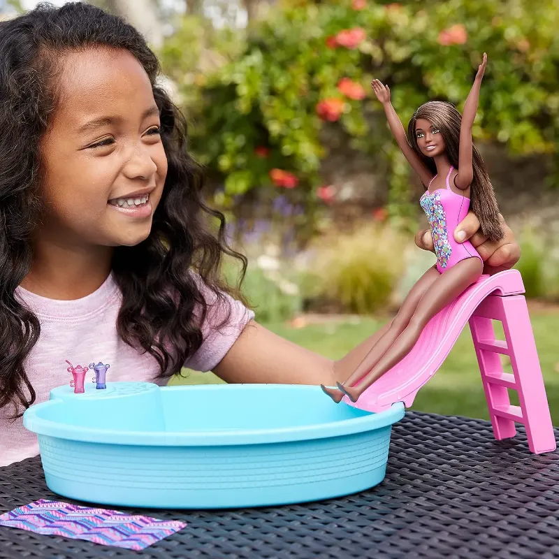 Deslize na diversão de verão com a boneca Barbie e sua piscina! É fácil encher e esvaziar a piscina para a festa e possui espaço para a Barbie e suas irmãs ou amigas (vendidas separadamente), é a festa na piscina perfeita! A boneca Barbie pode escorregar no toboágua e mergulhar na piscina ou pode relaxar na área com sofá integrado. Um design colorido inspira estilo e os acessórios estimulam histórias criativas. Duas bebidas geladas, dois porta-copos ao lado do sofá e uma toalha com uma estampa colorida ajudam a preparar o cenário para o dia de verão perfeito. A boneca Barbie está pronta para mergulhar na piscina com sua roupa de banho brilhante com estampas divertidas e florais. Deixa a criatividade rolar solta ao imaginar diversas histórias de versão com a boneca Barbie e sua piscina!