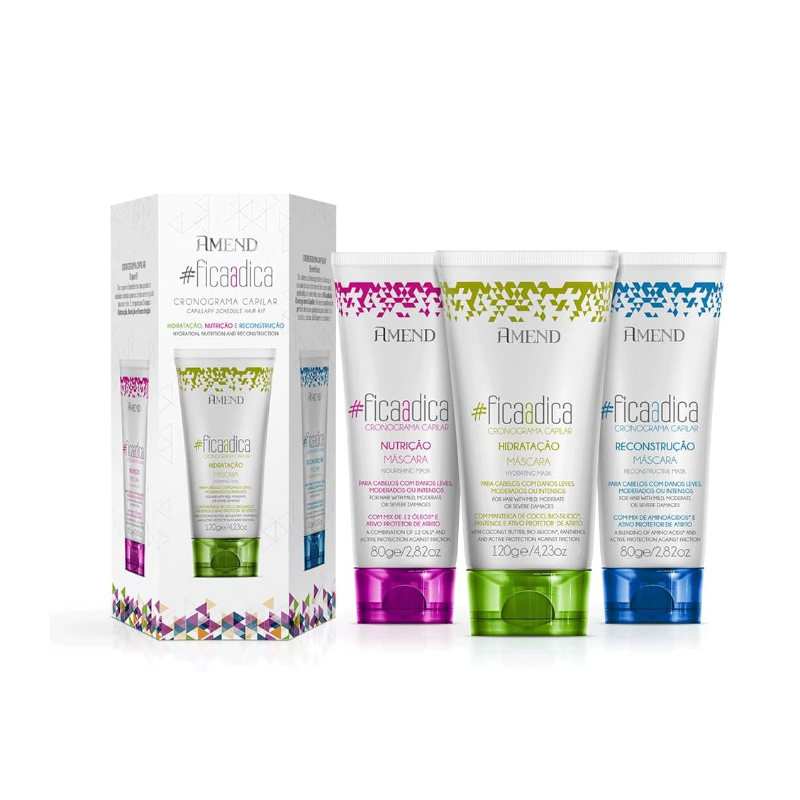 Kit Amend #Fica a dica Cronograma Capilar é indicado para todos os tipos de cabelos que sofrem com as agressões mecânicas e químicas, que necessitam recuperar a saúde dos fios. Composto por três máscaras: uma nutritiva, uma hidratante e uma reconstrutora, a proposta é alterná-las seguindo um cronograma capilar ao longo do mês, para total recuperação dos fios de acordo com o nível de dano existente. Além disso, promove a lubrificação necessária para impedir novos danos.