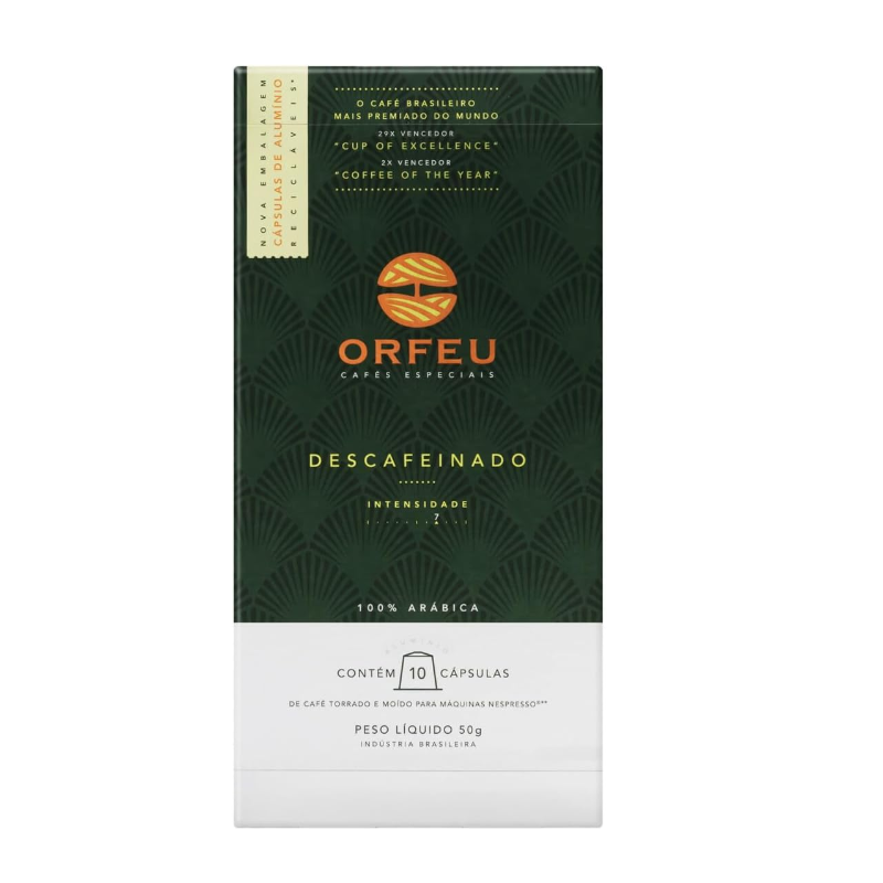 As cápsulas da Orfeu Descafeinado é um café especial 100% Arabica de torra escura, encorpado com baixa acidez e surpreendentes notas de chocolate. Sua intensidade é equivalente a 7. Cultivado a uma altitude entre 1000 a 1400 metros, a colheita é feita de forma sustentável. Este blend utiliza o método Swiss Water para extração da cafeína. Um processo a base de água e totalmente livre do uso de elementos químicos, que garante sabor agradável e sem amargor. Dada a grande preocupação e cuidado com a sustentabilidade, a Fazenda Sertãozinho tem vastas áreas de reserva, maior do que as exigências legais, e ainda planta cerca de duas mil árvores por ano, preservando a vegetação local. Além disso, as fazendas possuem certificação internacional UTZ, que compreende práticas agrícolas adequadas para a produção de café e o bem-estar dos trabalhadores, incluindo acesso à saúde e educação. Outros selos como Ecocert, Rainforest, ISO 9001:2015, USDA, Associação de Café Especial do Brasil (SCA).