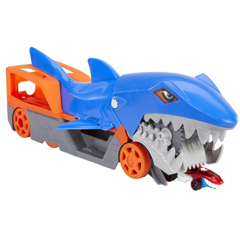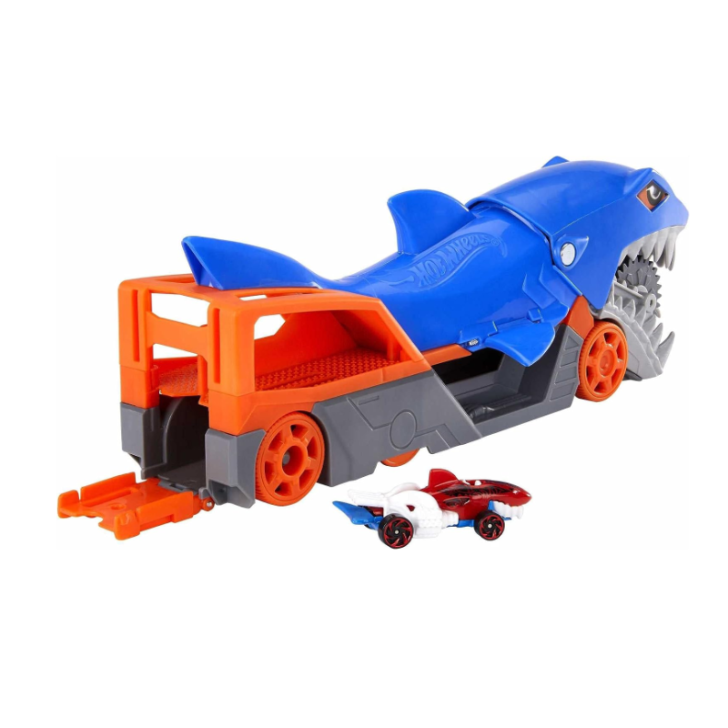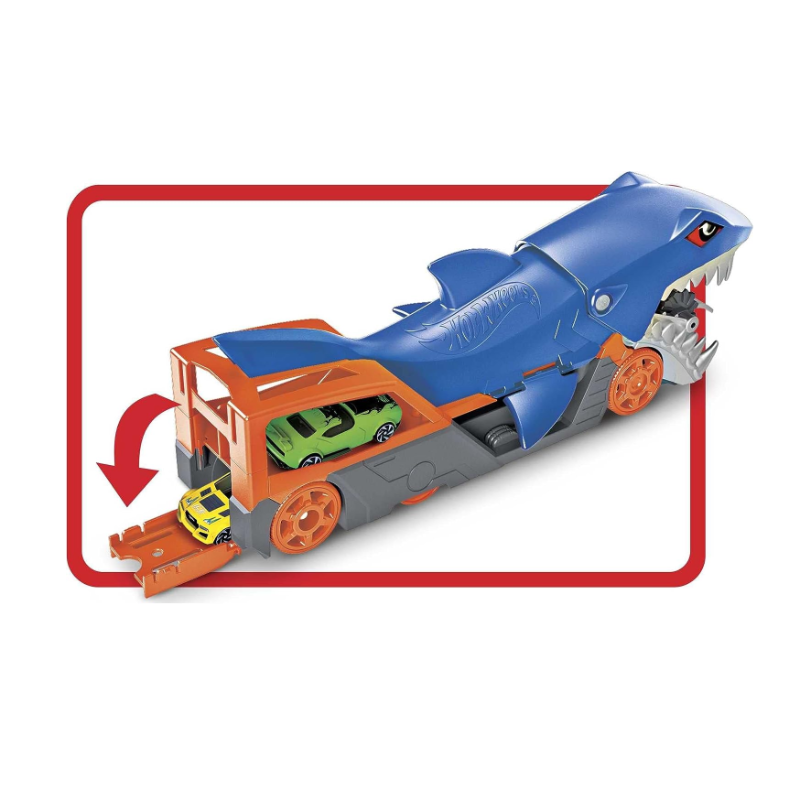 O conjunto de Guincho Tubarão Hot Wheels® recria o icônico Shark Bite™ Hot Wheels® como um caminhão totalmente novo e incrível. Basta empurrar o caminhão para ativar um mecanismo especial de mordida que faz o tubarão agarrar os carros direto com suas poderosas mandíbulas para engoli-los e guardá-los na barriga. E na hora de descarregar? Há uma rampa de saída na parte de trás para facilitar o acesso. O carro Guincho Tubarão Wheels® vem com um (1) carro Hot Wheels® em escala de 1:64 e comporta até mais quatro (vendidos separadamente)! Crianças a partir de 4 anos vão adorar fazer o tubarão dar mordidas e engolir os carros! As cores e as decorações podem variar.