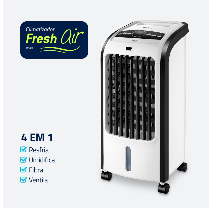 O Climatizador Mondial Fresh Air proporciona ar fresco e um ambiente confortável para sua família. Com 4 funções, o climatizador resfria, umidifica, filtra e ventila. Conta com 3 velocidades de ventilação, além das funções resfriar e oscilar. Possui função Timer que possibilita programar o tempo de funcionamento e oscilação das aletas, que assegura uma distribuição uniforme de ar na casa. Saiba mais sobre o CL-03 da Mondial: