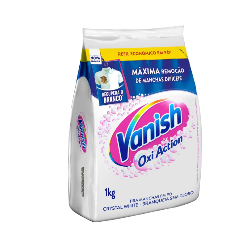 Vanish Oxi Action Crystal White é o potencializador de lavagem em pó e branqueador, sem cloro, que deixa o branco mais branco, mesmo após 50 lavagens¹. Sua exclusiva fórmula com poder Oxi tira as manchas mais difíceis, branqueia, elimina odores e mata 99,9% de vírus e bactérias², deixando suas roupas brancas mais brancas e como novas por mais tempo. Você sabe como tirar mancha de roupa branca? Vanish em pó Crystal White é prático e eficiente. Uma medida (60g) remove até as manchas mais difíceis, sem danificar o tecido e sem precisar esfregar. Para remover manchas difíceis e deixar o branco mais branco, adicione uma medida (60g) de Vanish no molho em 4L de água a 40°C e deixe por 1 hora ou na lavagem em máquina com seu sabão/detergente de preferência. Para saber mais sobre o modo de uso, confira o rótulo. Diga adeus às roupas amareladas! Vanish Crystal White deixa sua roupa branca como nova por mais tempo. Confie no Multipower! Especialista em tratamento de tecidos, Vanish é o tira manchas número 1 do Brasil³. Vanish Crystal White possui agentes branqueadores que recuperam o branco, já na primeira lavagem. Ele remove manchas de café, chá, molho de soja, chocolate, polpa de frutas vermelhas, manteiga e vinho, entre outras, sem precisar esfregar. É uma revolução no cuidado com as roupas! Você não precisa sofrer para repetir seus looks brancos e para lavar os uniformes das crianças. Vanish é seu aliado na remoção das manchas mais difíceis. Não deixe faltar em casa! Ele trata manchas e elimina o amarelado, dando vida nova também às toalhas e roupas de cama. Vanish traz mais higiene e cuidado para sua família. Tradição e Eficiência Vanish está presente no Brasil há mais de 20 anos. É uma marca que se utiliza de alta tecnologia para desenvolver produtos cada vez mais eficientes para seus consumidores. O resultado são roupas sem manchas, com os tecidos protegidos e como novas por mais tempo. E para ter roupas coloridas livres de manchas, odores e vírus e bactérias, experimente Vanish Oxi Advance, e para roupas coloridas como novas, experimente Vanish Oxi Action. ¹Em condições de molho e/ou molho seguido de lavagem na máquina após algumas lavagens. Leia atentamente o rótulo antes de usar o produto. ²Mata 99,9% das bactérias testadas. Salmonella choleraesuis, Staphylococcus aureus, Pseudomonas aeruginosa e Klebsiella pneumoniae. ³Fonte: Nielsen IQ, Retail Index. Dados do período DEZ´21 ATÉ NOV ´22 (MAT´22). Abrangência geográfica Total Brasil. Mercado PC 15: ÁGUA SANITÁRIA E ALVEJANTES. Canais reportados: INA + C&C. 4 benefícios do produto em condições testadas. Leia atentamente o rótulo antes de usar o produto